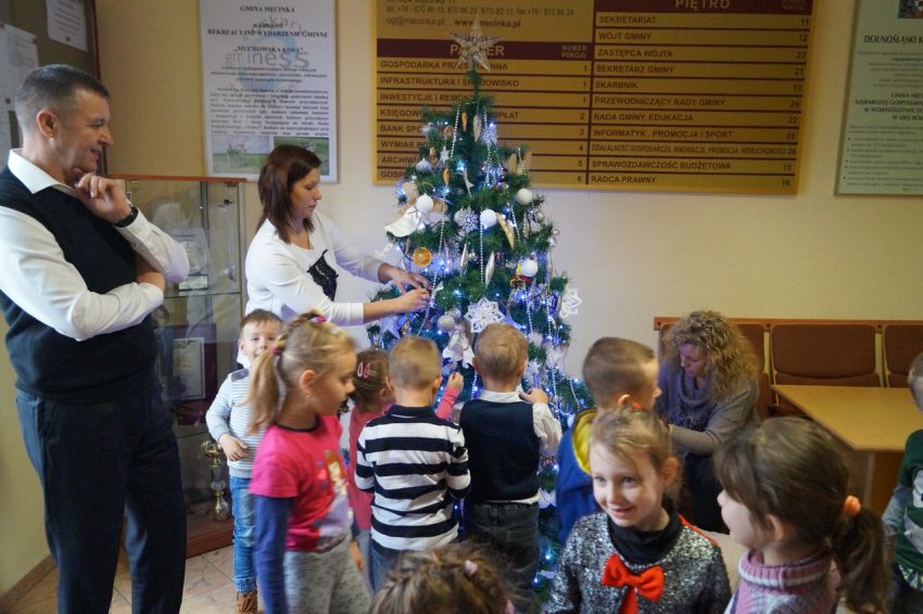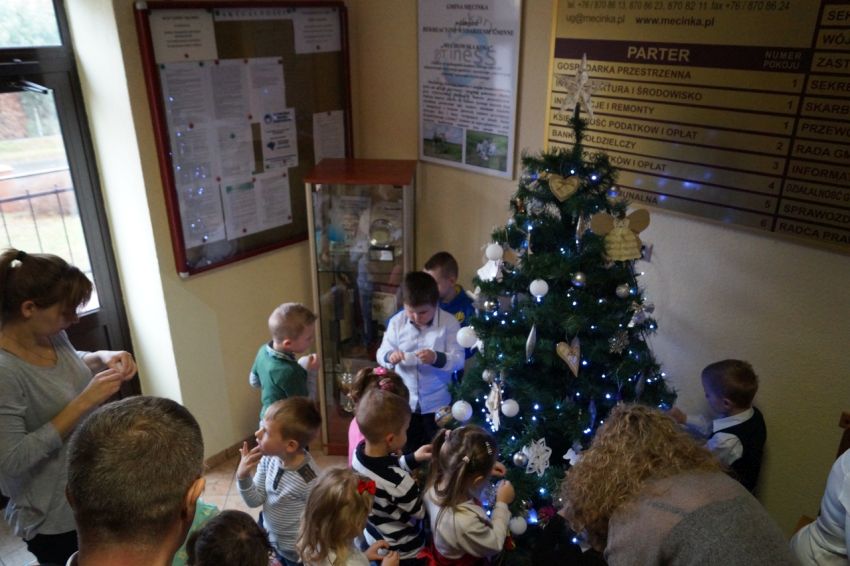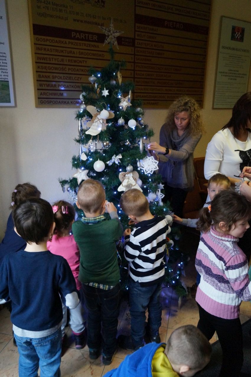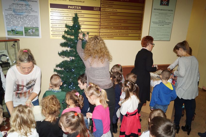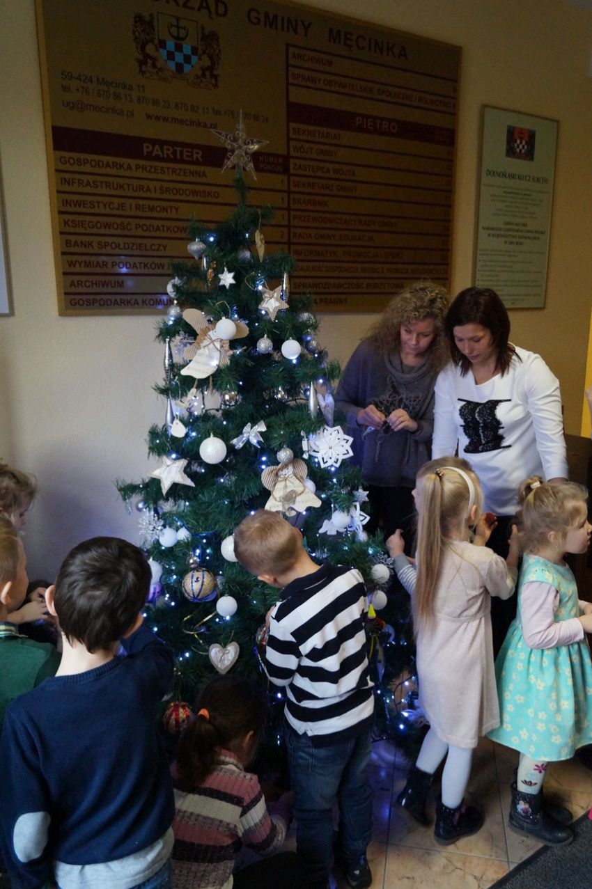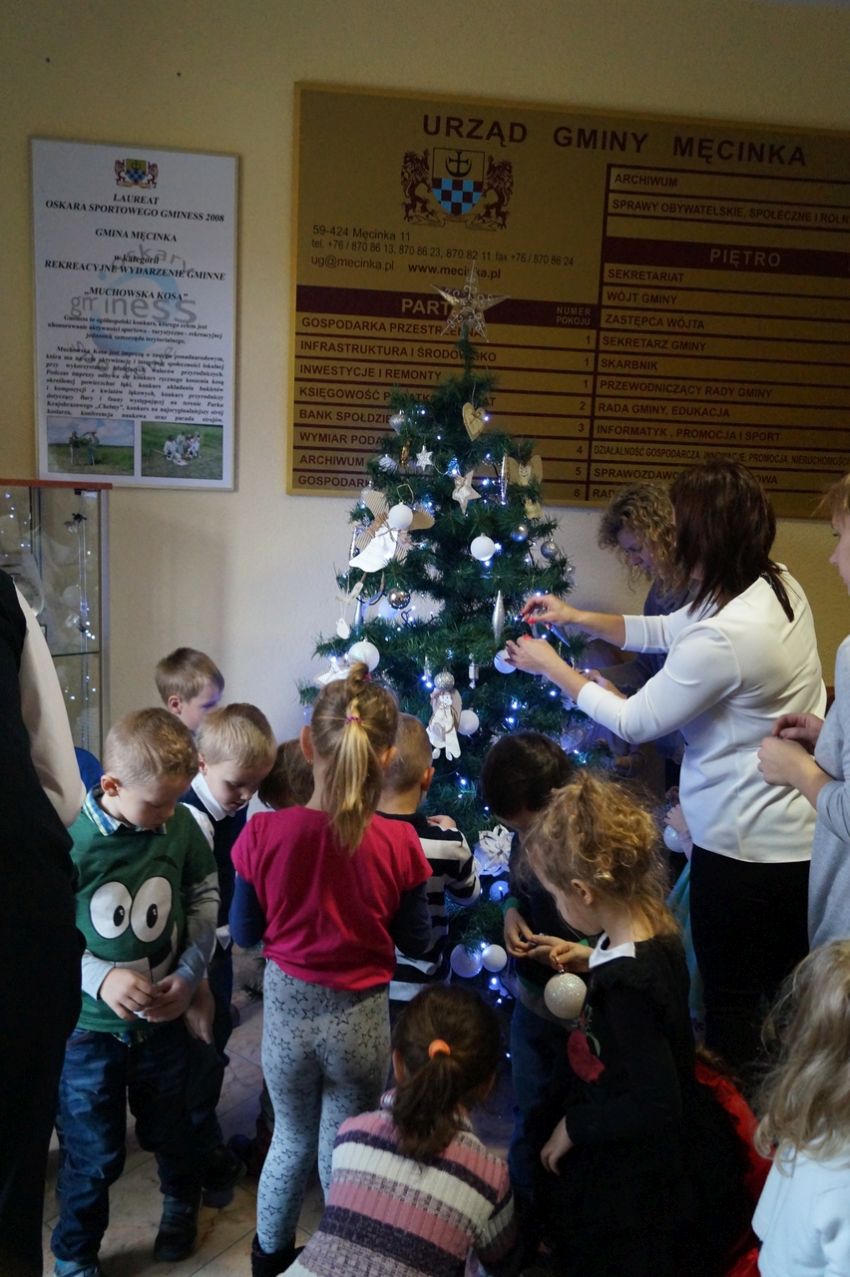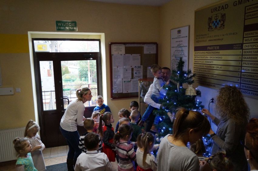 Na zaproszenie wójta przedszkolaki z Męcinki oraz Piotrowic ubierały choinkę w Urzędzie Gminy w Męcince. Dzieci przybyły z prezentami świątecznymi oraz ozdobami, którymi przyozdobiły urząd oraz świąteczne drzewko.