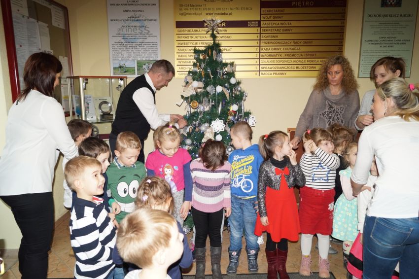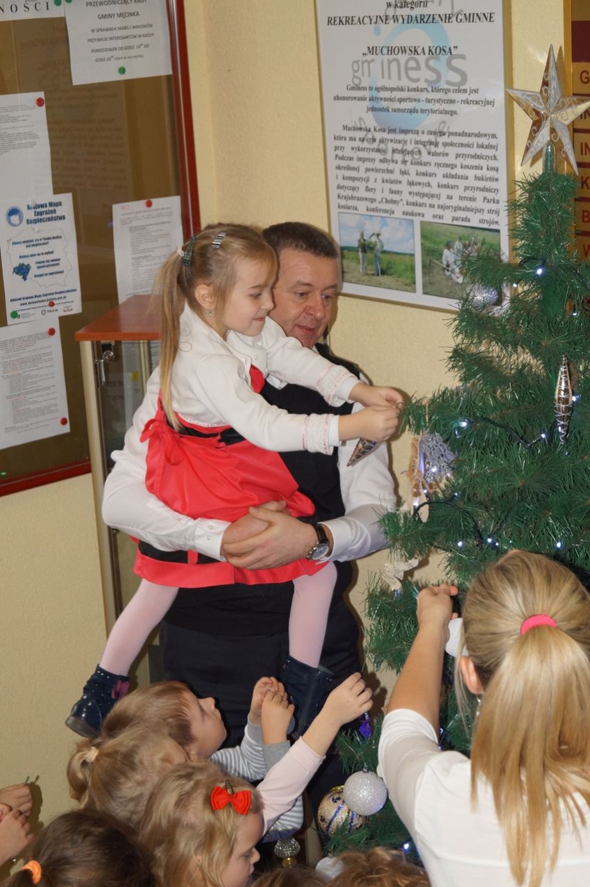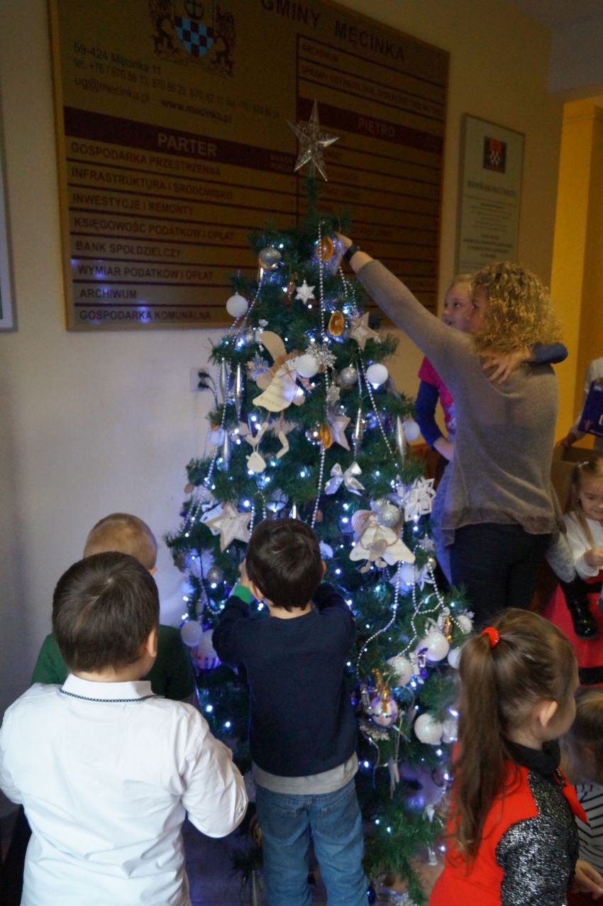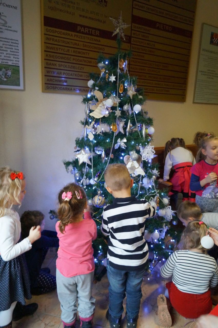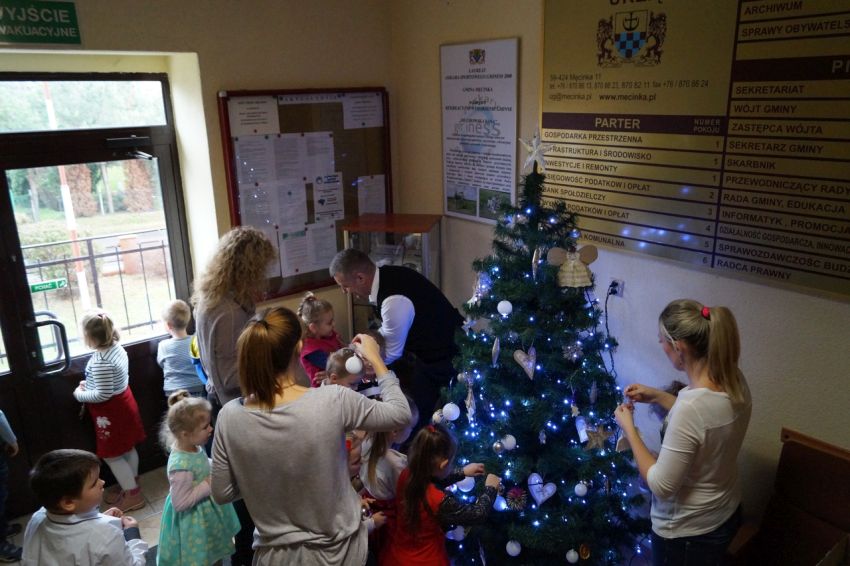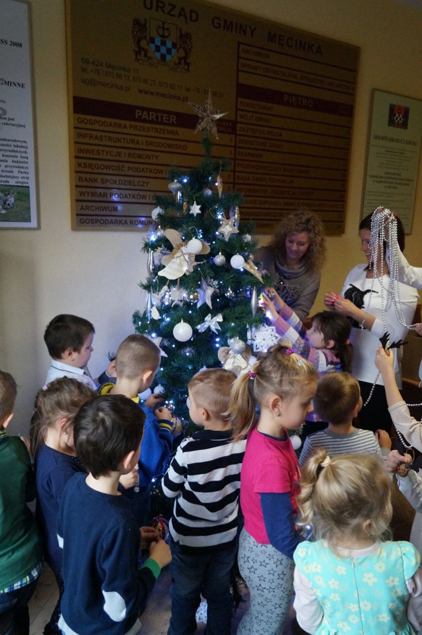Na zaproszenie wójta przedszkolaki z Męcinki oraz Piotrowic ubierały choinkę w Urzędzie Gminy w Męcince. Dzieci przybyły z prezentami świątecznymi oraz ozdobami, którymi przyozdobiły urząd oraz świąteczne drzewko.