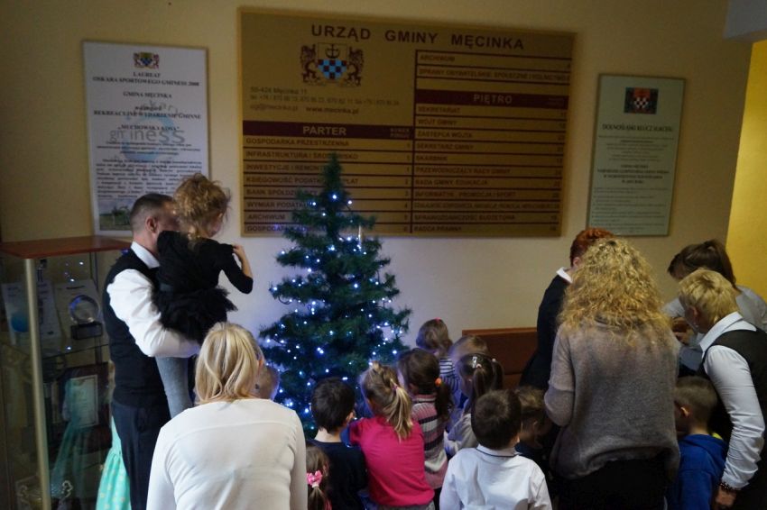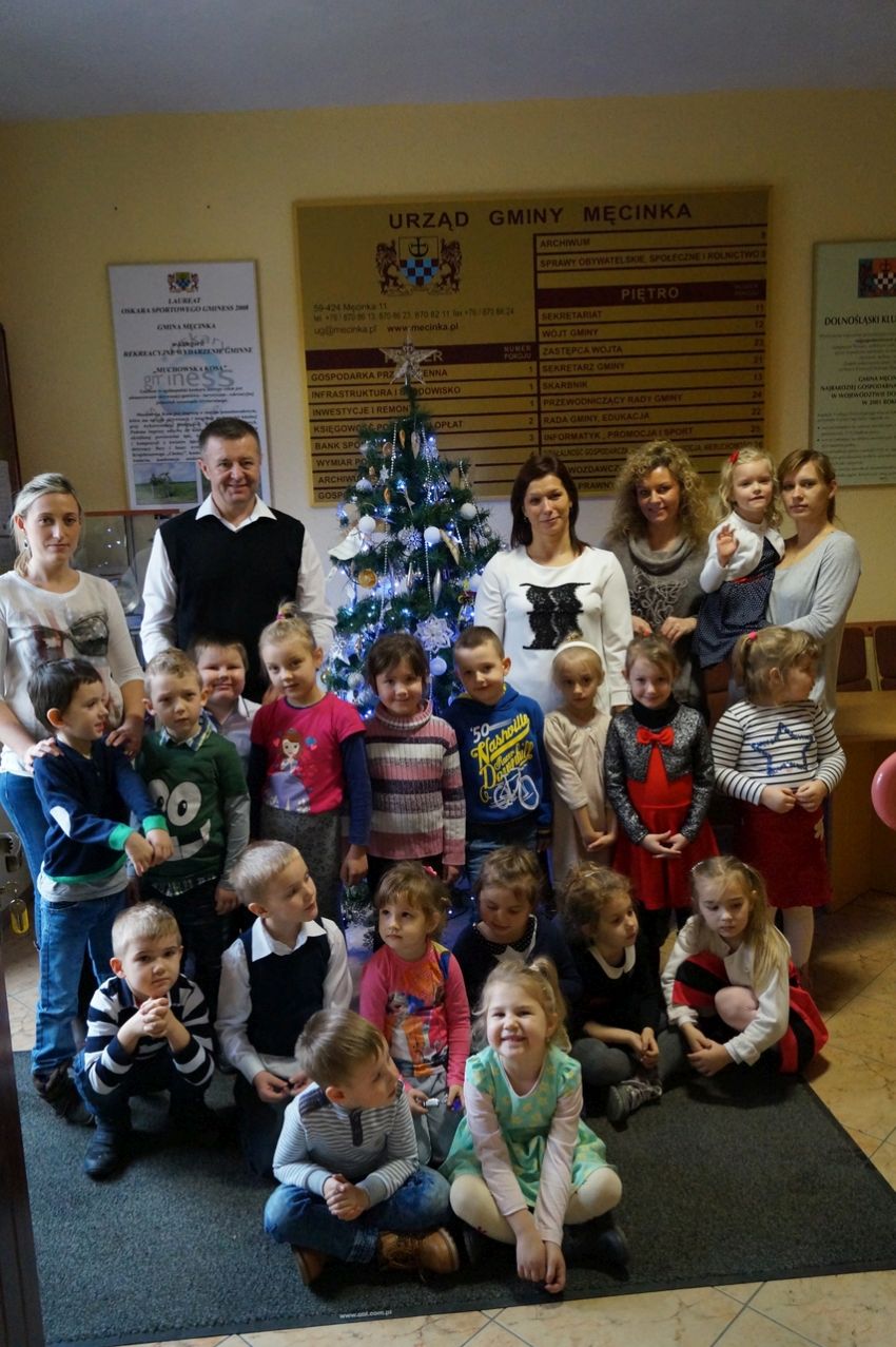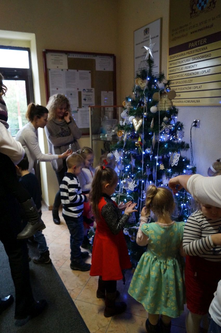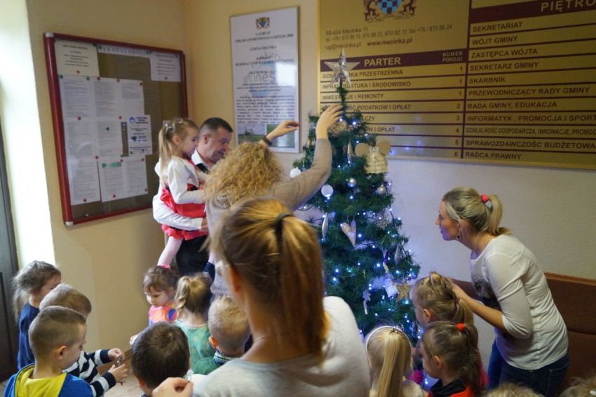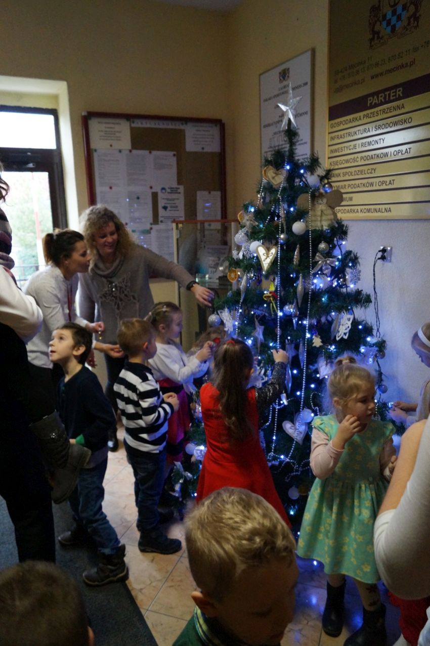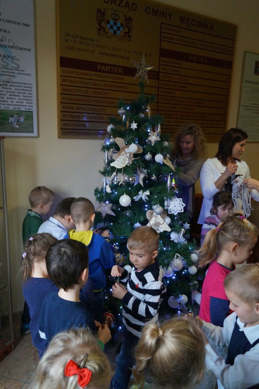 Na zaproszenie wójta przedszkolaki z Męcinki oraz Piotrowic ubierały choinkę w Urzędzie Gminy w Męcince. Dzieci przybyły z prezentami świątecznymi oraz ozdobami, którymi przyozdobiły urząd oraz świąteczne drzewko.
