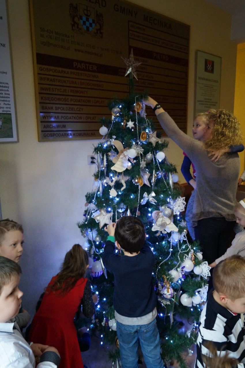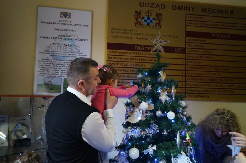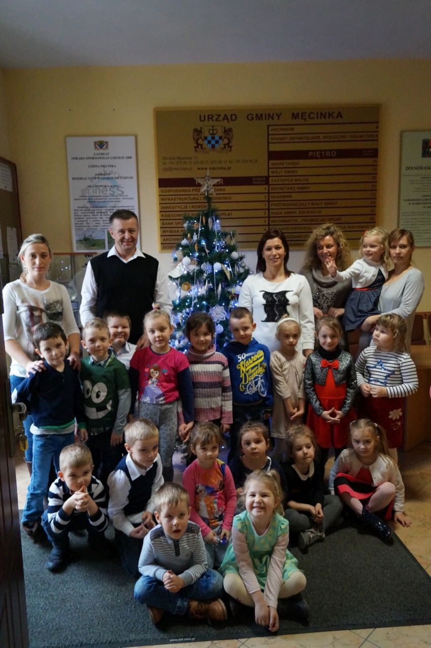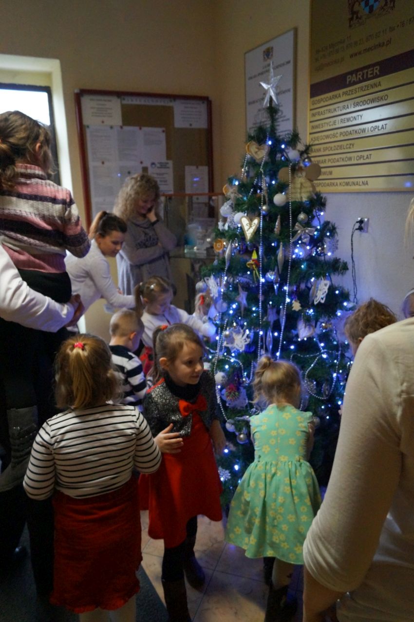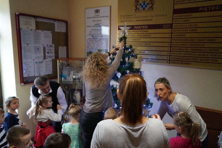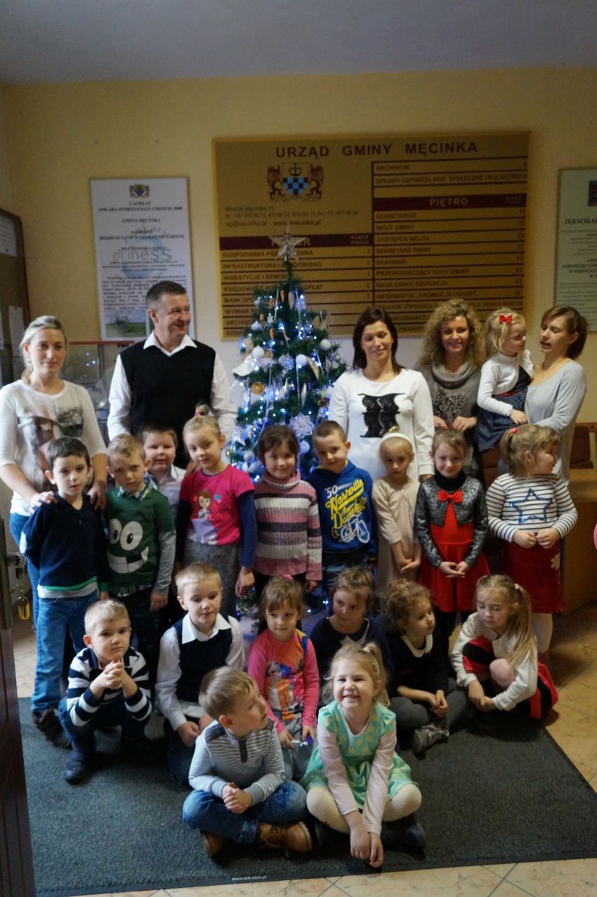 Na zaproszenie wójta przedszkolaki z Męcinki oraz Piotrowic ubierały choinkę w Urzędzie Gminy w Męcince. Dzieci przybyły z prezentami świątecznymi oraz ozdobami, którymi przyozdobiły urząd oraz świąteczne drzewko.