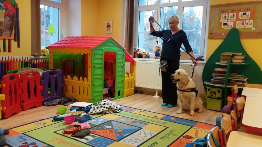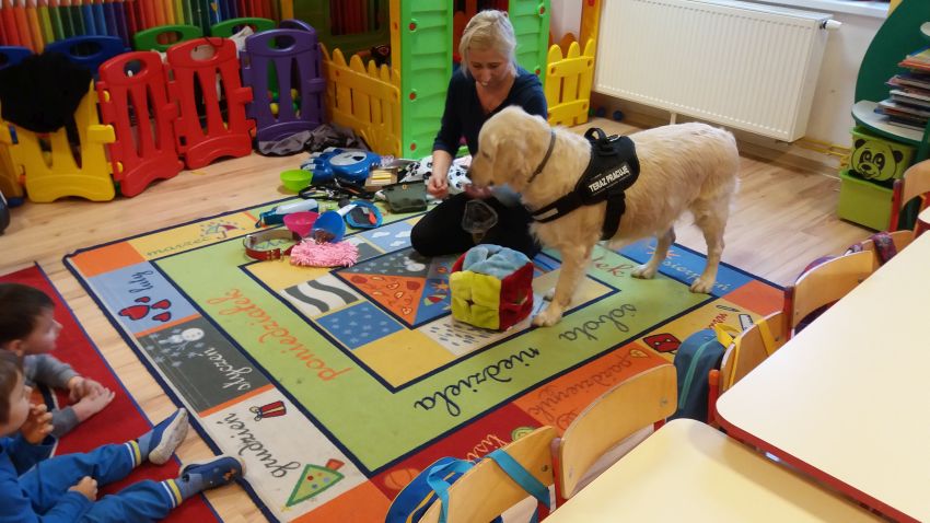 Przedszkolaków z Punktu Przedszkolnego Słoneczko w Pomocnem odwiedził specjalny gość – pies Futuro z terapeutą integracji sensorycznej - Małgorzatą Hasiuk.