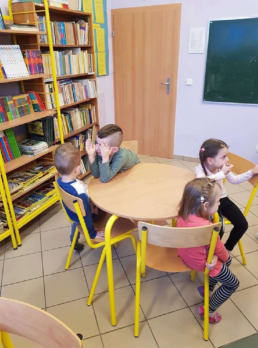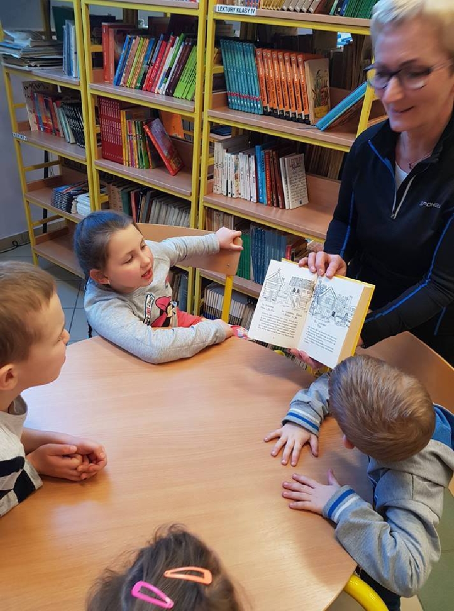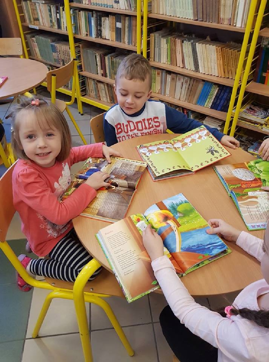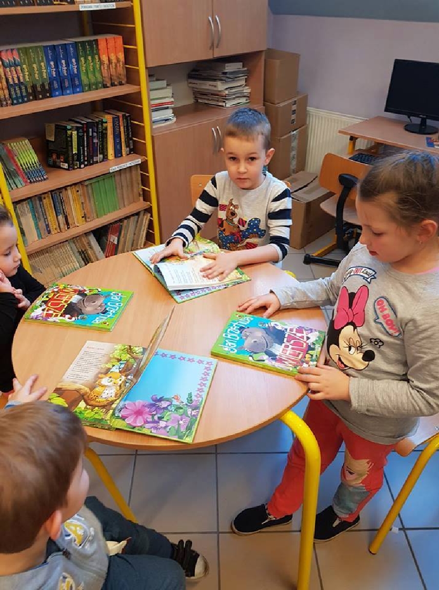 Dzieci z przedszkola odwiedziły szkolną bibliotekę. Pani Bibliotekarka pokazała dzieciom, gdzie znajduje się przeznaczony specjalnie dla nich regał z książkami. Następnie zaprezentowała i dała do obejrzenia dzieciom książeczki z działu dziecięcego. Przedszkolakom bardzo spodobały się kolorowe i bogato ilustrowane książeczki, które z chęcią oglądały. Zobaczyły jak wygląda karta czytelnika oraz poznały zasady wypożyczania książek, zachowania się w bibliotece. Dowiedziały się także jak należy dbać o książki. Spotkanie odbywało się w miłej, pełnej uśmiechów i wrażeń atmosferze. Dla wielu przedszkolaków, była to pierwsza wizyta w „domu książek”, ale na pewno nie ostatnia.