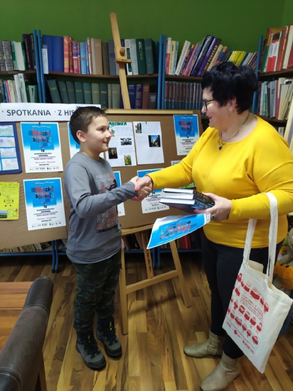 W GBP w Męcince kierownik Elżbieta Chodor wręczyła nagrodę -wyróżnienie w konkursie plastyczno-literackim „Bliskie spotkania z historią”, od organizatora projektu „Przygoda z historią w tle, czyli walizka pełna książek” – Dolnośląskiej Biblioteki Publicznej im. Tadeusza Mikulskiego we Wrocławiu , Mateuszowi Regulskiemu uczniowi kl. IV z Zespołu Szkolno-Przedszkolnego w Męcince, który wykonał prace w formie komiksu „Historia Sichowa”.