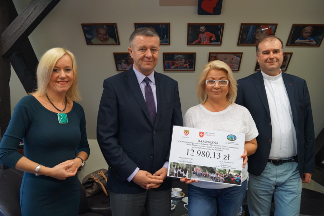 Taką kwotę na rzecz dzieci z chorobą nowotworową udało się zebrać podczas pielgrzymki na Kalwarię w Męcince 13 września br. W dniu 18 września 2015r. w imieniu uczestników pielgrzymki oraz mieszkańców Gminy Męcinka wójt Mirosław Brzozowski oraz ks. dr Marek Kluwak Proboszcz Parafii pw. Św. Andrzeja Apostoła w Męcince przekazali zebraną sumę na ręce prezes Fundacji na Ratunek Dzieciom z Chorobą Nowotworową pani Agnieszki Aleksandrowicz Zdral.