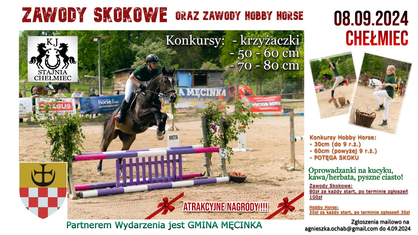 Początek września zapowiada się bardzo aktywnie i widowiskowo dla miłośników jazdy konnej na terenie Gminy Męcinka. A to za sprawą zaplanowanych przez Klub Jeździecki „Stajnia” w Chełmcu na dzień 8 września 2024 r. Zawodów skokowych oraz hobby horse.