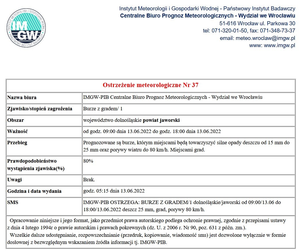 Informujemy, że zgodnie z przesłanym ostrzeżeniem IMGW w dniu dzisiejszym (poniedziałek 20.06.2022 r.) na terenie powiatu jaworskiego, do późnych godzin wieczornym prognozowane są burze, którym miejscami będą towarzyszyć bardzo silne opady deszczu od 25 mm do 35 mm oraz porywy wiatru do 100 km /h. Miejscami także grad.