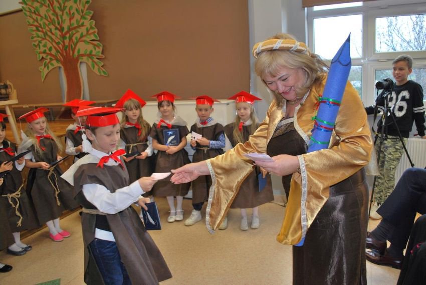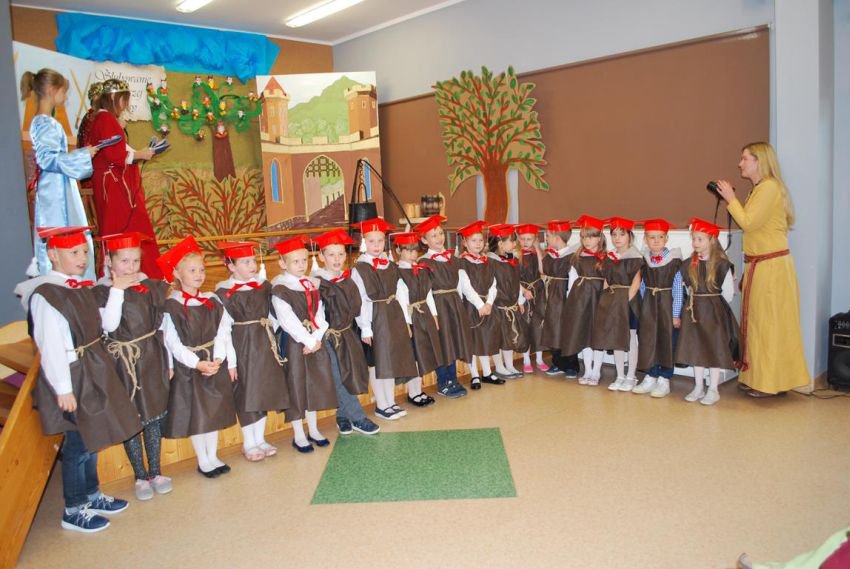 Dzieci w scenerii zamkowej, poprzebierane za giermków, zaprezentowały swoje umiejętności aktorskie przedstawiając wspólnie ze starszymi uczniami: Kasią Ciesielską, Julią Zańczak i Adamem Dubińskim inscenizację pt. "W Krainie Królestwa Wiedzy", wykazując się znajomością przepisów ruchu drogowego, wiadomościami przyrodniczymi, pięknym śpiewem i recytacją wierszyków o przyjaźni i koleżeństwie w grupie rówieśniczej. Wszystko to udowodniło, że nasze pierwszaki są gotowe do sumiennej pracy w szkole.