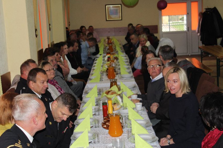 Po uroczystości oficjalnej wielu mieszkańców gminy, a także goście zaproszeni spotkali się na wspólnym poczęstunku w świetlicy wiejskiej, gdzie zaprezentowany został film o naszych strażakach oraz konkurs z nagrodami.