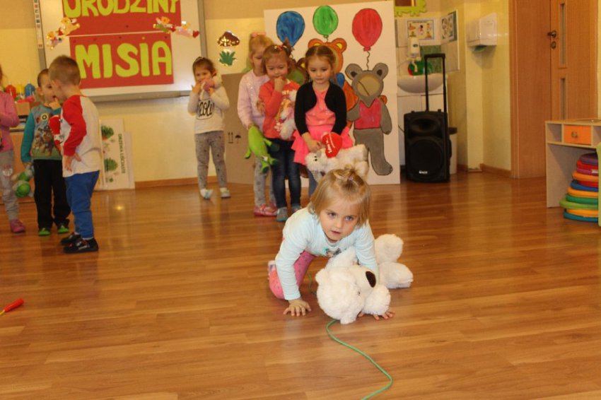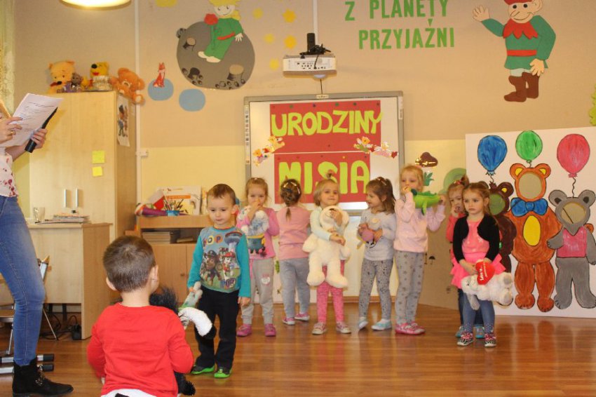 Grupa Krasnale z Planety Przyjaźni i Krasnale z Planety Radości wspólnie świętowały Światowy Dzień Pluszowego Misia. Tego dnia każdemu maluchowi towarzyszył jego pluszak. Dzieci poznały historię małego niedźwiadka, który do dzisiaj nosi angielską nazwę Teddy. Podczas zajęć dzieci śpiewały, tańczyły, mówiły rymowankę razem ze swoimi misiami. Odbyły się też konkurencję: wyjadanie miodku, zbieranie wykałaczek rękawicą kuchenną, przejście misiów leśną ścieżką, zabawa plastyczna- rysuję misia. Zajęcia przygotowała i prowadziła Pani Anna Łękawa.