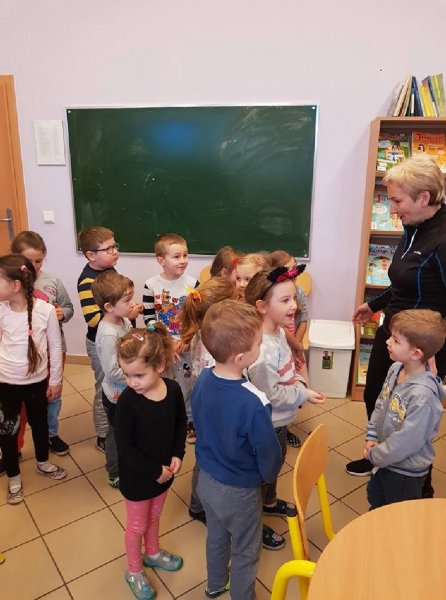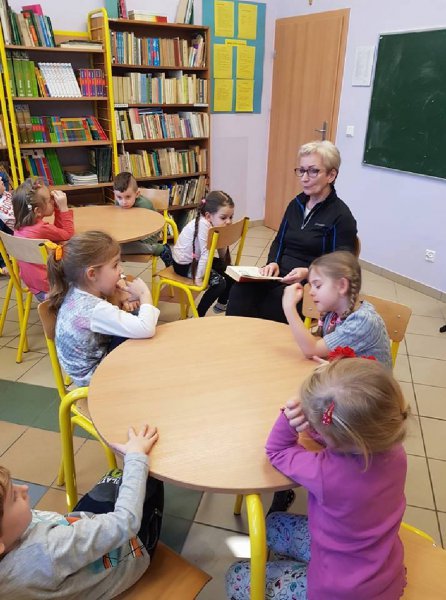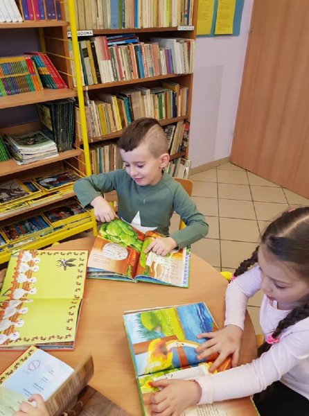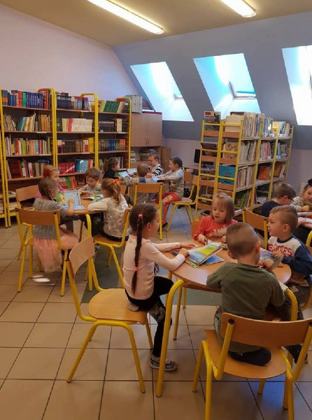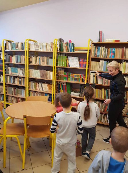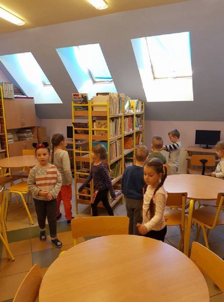 Dzieci z przedszkola odwiedziły szkolną bibliotekę. Pani Bibliotekarka pokazała dzieciom, gdzie znajduje się przeznaczony specjalnie dla nich regał z książkami. Następnie zaprezentowała i dała do obejrzenia dzieciom książeczki z działu dziecięcego. Przedszkolakom bardzo spodobały się kolorowe i bogato ilustrowane książeczki, które z chęcią oglądały.