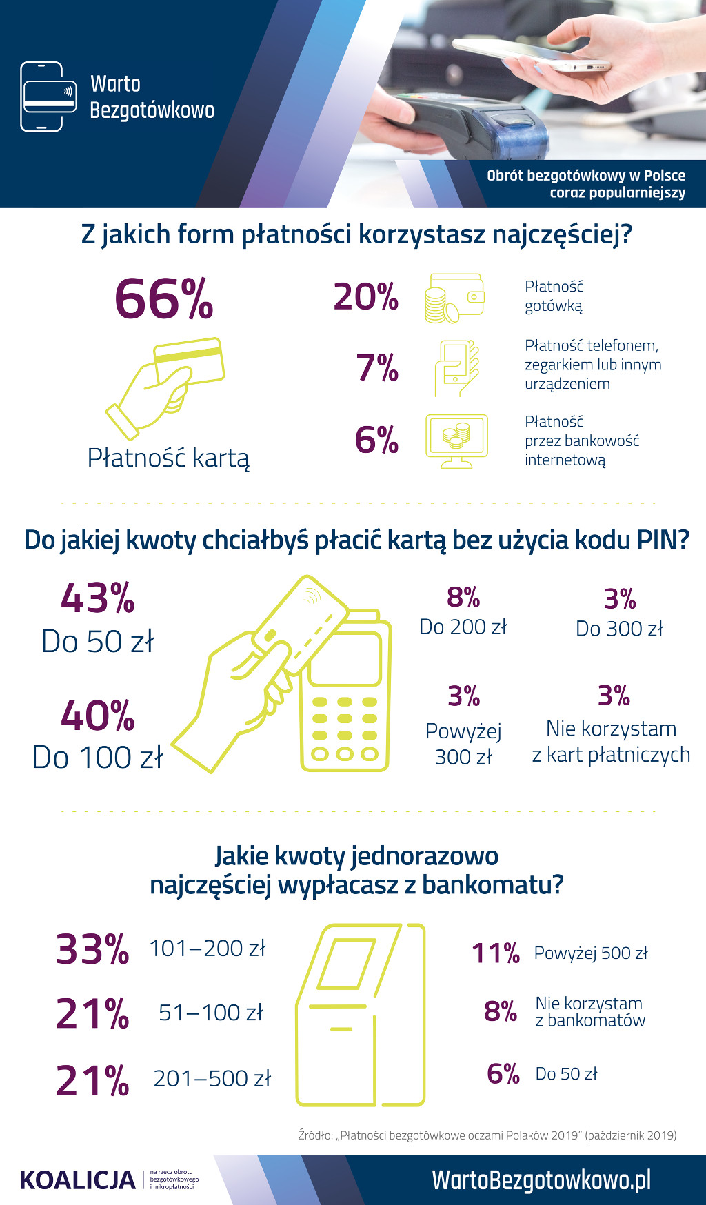 Za najbardziej preferowaną formę płatności Polacy uznają płatność kartą, choć jedynie 8% z nich deklaruje przy tym, że w ogóle nie korzysta z bankomatów i gotówki. Najczęściej z brakiem możliwości płatności bezgotówkowych ankietowani spotykają się na targowiskach i bazarach (51%) – to jedne z wniosków płynących z badania „Płatności bezgotówkowe oczami Polaków 2019”, opublikowanego przy okazji kolejnej edycji kampanii informacyjnej „Warto Bezgotówkowo”.