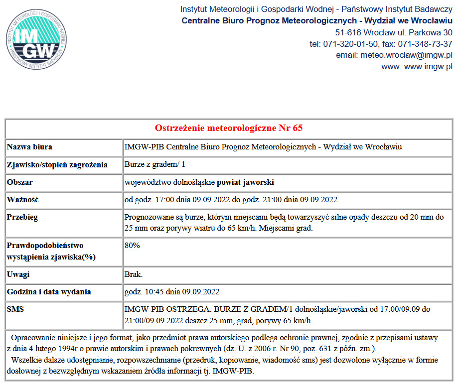 Instytut Meteorologii i Gospodarki Wodne ostrzega, że w dniu dzisiejszym (czwartek 09.09.2022 r.) od godz. 13:00 na terenie powiatu jaworskiego prognozowane są burze, którym miejscami będą towarzyszyć bardzo silne opady deszczu od 20 mm do 25 mm, oraz porywy wiatru do 65 km/h, a nawet miejscami może wystąpić grad.