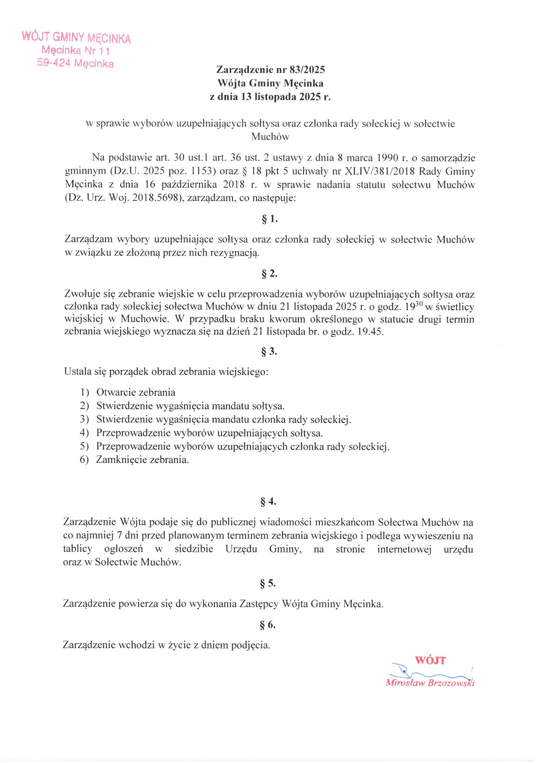 Zawiadomienie - zebranie wiejskie sołectwa Muchów czwartek, 13, listopad 2025 09:30 Drukuj fUdostępnij Zarządzenie nr 83/2025 Wójta Gminy Męcinka (fomrat JPG) Poprzedni artykuł Następny artykuł