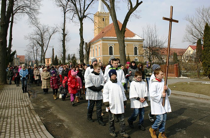 Stacje wykonano z brzozowych krzyży i rozmieszczono przy drogach okalających kościół. Na czele procesji kroczyła służba liturgiczna, a oprawę muzyczną zapewniła schola Eden. Poszczególne rozważania Męki Pańskiej, związane z Rokiem Wiary, przygotowała katechetka Wiesława Kostrzewa.