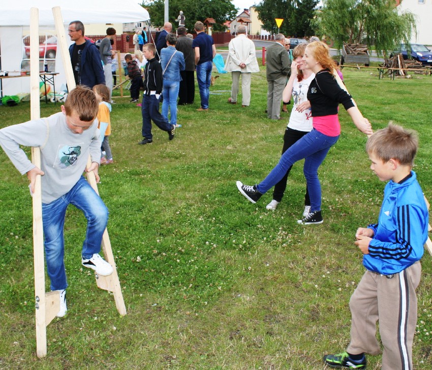 Jeśli ktoś uważa, że chodzenie na szczudłach to żaden wyczyn – jest w błędzie. Nie wszyscy wykazali się koordynacją ruchów. Za to kręcenie bioderkami z hula-hoop szło już dużo lepiej. Spore wrażenie zrobiły na nas liczne i wyjątkowe ciasta przygotowane przez miejscowe gospodynie. Ze względu na „niepewną” pogodę biesiadę przy muzyczce przewidziano wieczorem, korzystając ze świetlicy wiejskiej przy OSP.