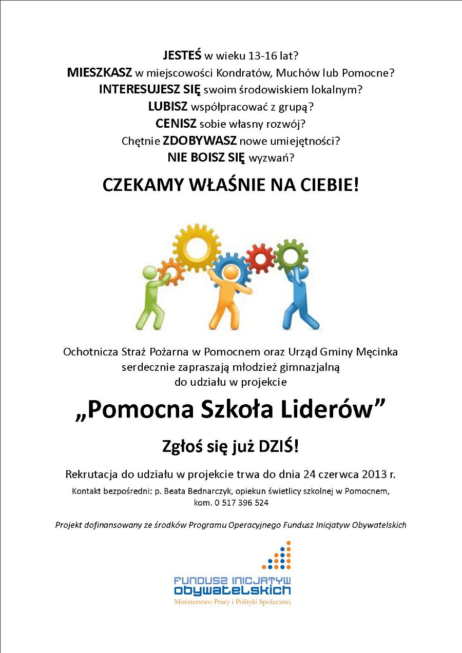W ramach otrzymanego dofinansowania z Programu Operacyjnego Fundusz Inicjatyw Obywatelskich Ochotnicza Straż Pożarna w Pomocnem we współpracy z Urzędem Gminy Męcinka będzie realizować półroczny projekt skierowany do młodzieży w wieku 13-16 lat z miejscowości Kondratów, Muchów i Pomocne. Wśród działań przewidzianych w ramach projektu znajdują się wyjazdowe warsztaty integracyjne, gra terenowa, warsztaty fotograficzne, warsztaty z komunikacji i tematyki obywatelskiej, warsztaty plastyczne, happening oraz organizacja wystawy fotograficznej.