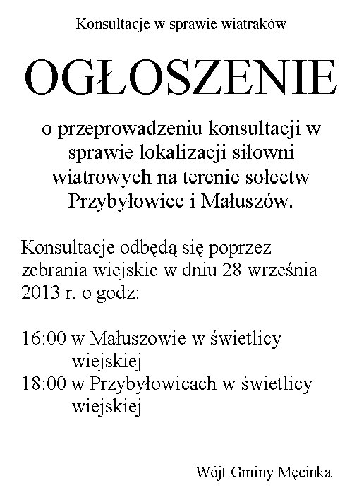 o przeprowadzeniu konsultacji w sprawie lokalizacji siłowni wiatrowych na terenie sołectw Przybyłowice i Małuszów.