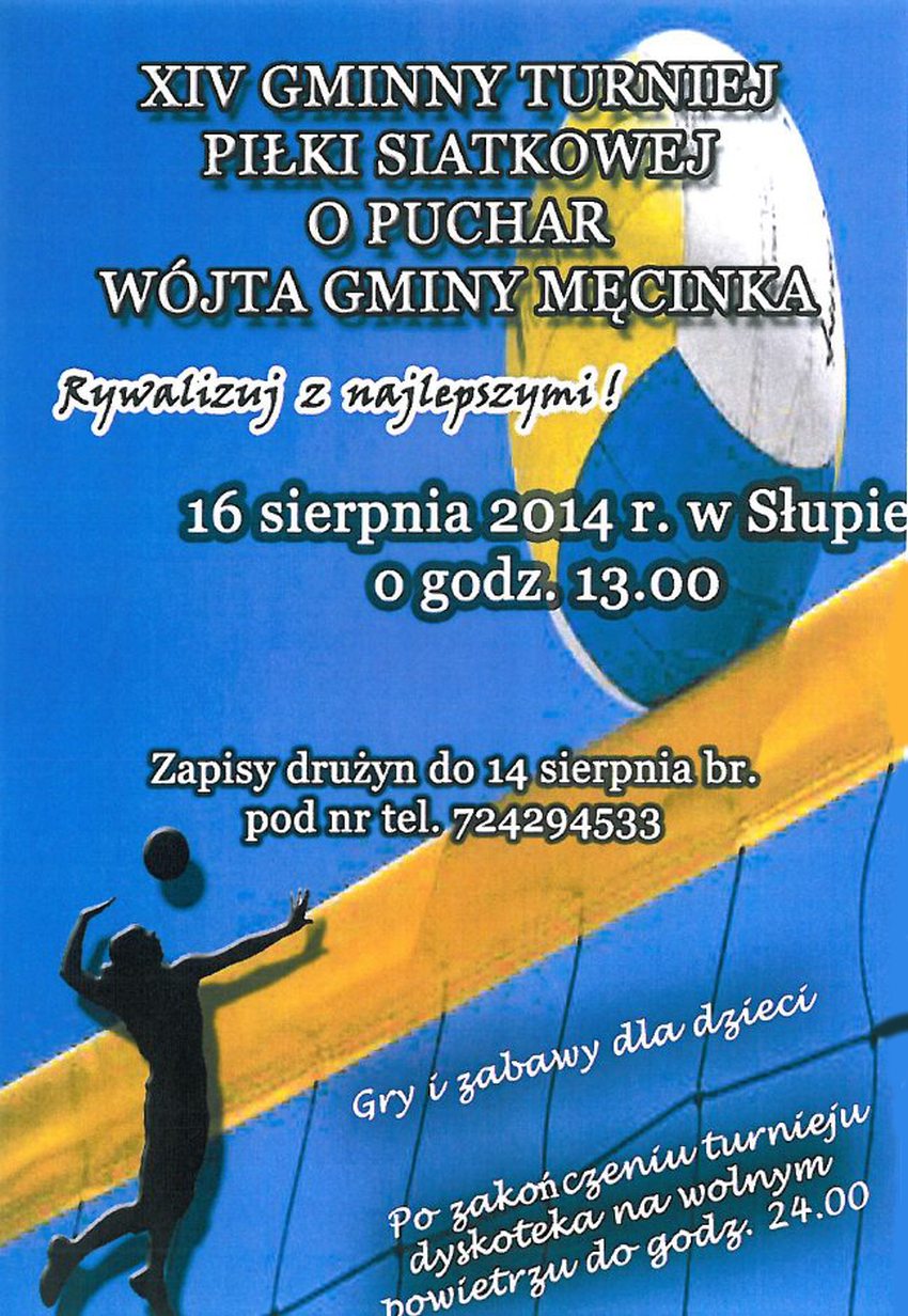 XIV GMINNY TURNIEJ PIŁKI SIATKOWEJ O PUCHAR WÓJTA GMINY MĘCINKA środa, 06, sierpień 2014 08:47 Drukuj fUdostępnij Zapisy drużyn do 14 sierpnia br. pod nr tel. 724294533 Powiększ plakat (format JPG)