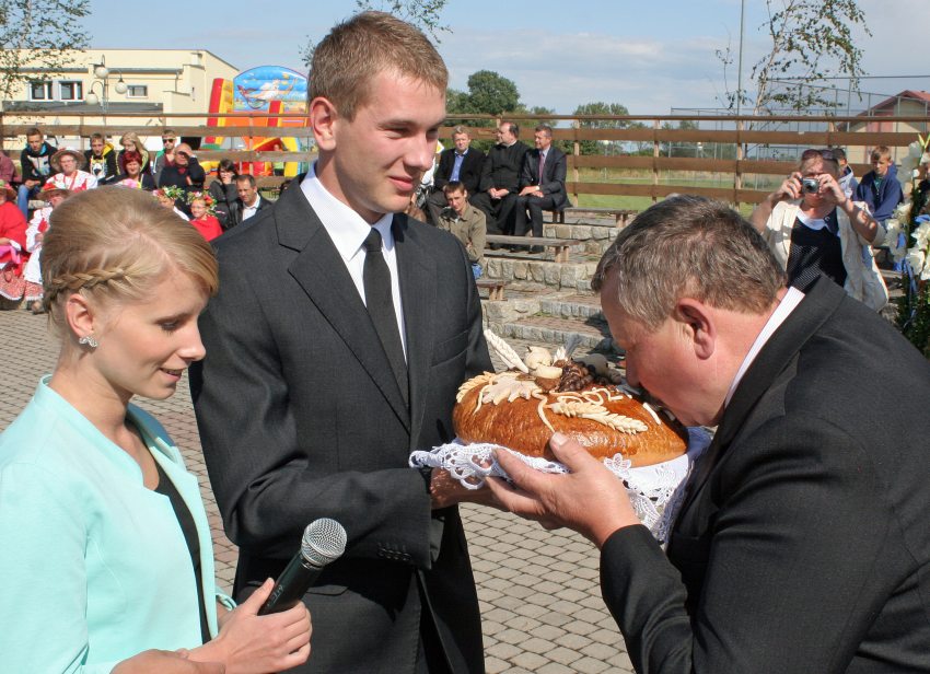 Poświęcony, dożynkowy bochen chleba ponieśli w barwnym korowodzie starostowie – Ilona Suska i Kacper Baran. W pochodzie uczestniczył wójt, miejscowi radni i zespoły ludowe Ojry Bis z Męcinki i PERŁA z Przybyłowic. Sołtys Zygmunt Baran wspólnie z wójtem Zbigniewem Przychodzeniem podzielili bochen wśród wszystkich zebranych. Po tradycyjnym obśpiewaniu wieńca część artystyczną przedstawiły wspomniane zespoły i miejscowa grupa artystyczna – kabaret Żmije. Były brawa, łzy śmiechu i zabawa przy zespole muzycznym KRISSO.