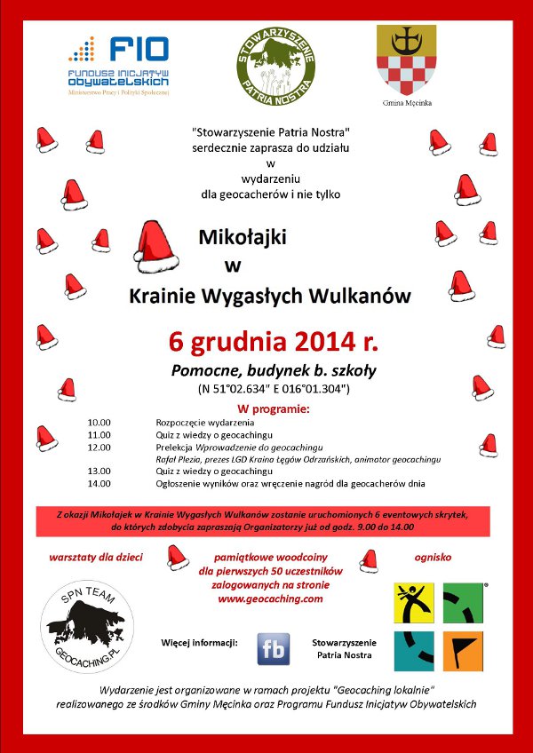 W Pomocnem 6 grudnia między godziną 10.00 a 14.00 również odbyło się takie spotkanie geokeszerów, jak również wszystkich osób, które zechcą więcej się dowiedzieć na ten temat, czym jest geocaching. W programie eventu Mikołajki w Krainie Wygasłych Wulkanów, oprócz oczywiście nowych skrytek, które będzie trzeba odnaleźć, odbyły się m.in. wykład na temat geocachingu, zabawy dla dzieci, ognisko i niespodzianki.