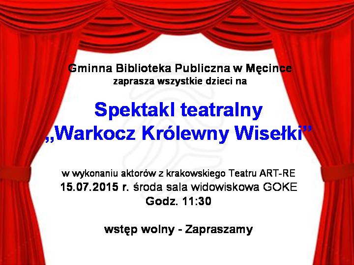 Spektakl teatralny "Warkocz Królewny Wisełki" czwartek, 09, lipiec 2015 08:56 Drukuj fUdostępnij 15.07.2015 r. środa sala widowiskowa GOKE godz. 11:30wstęp wolny - Z a p r a s z a m yPowiększ plakat (format JPG)