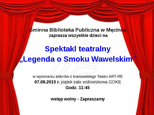 Spektakl teatralny "Legenda o Smoku Wawelskim" czwartek, 06, sierpień 2015 14:44 Drukuj fUdostępnij 07.08.2015 r. piątek sala widowiskowa GOKE godz. 11:45wstęp wolny - Z a p r a s z a m y Powiększ plakat (format JPG)
