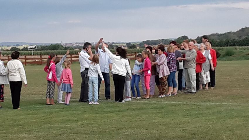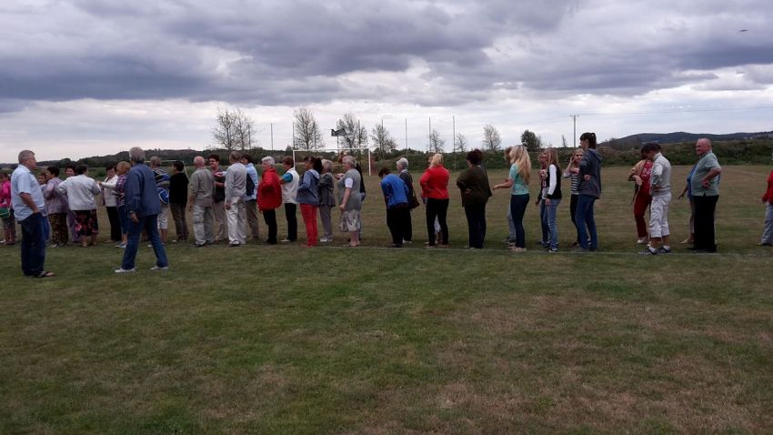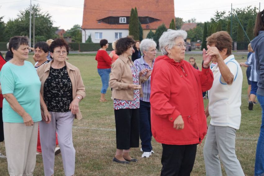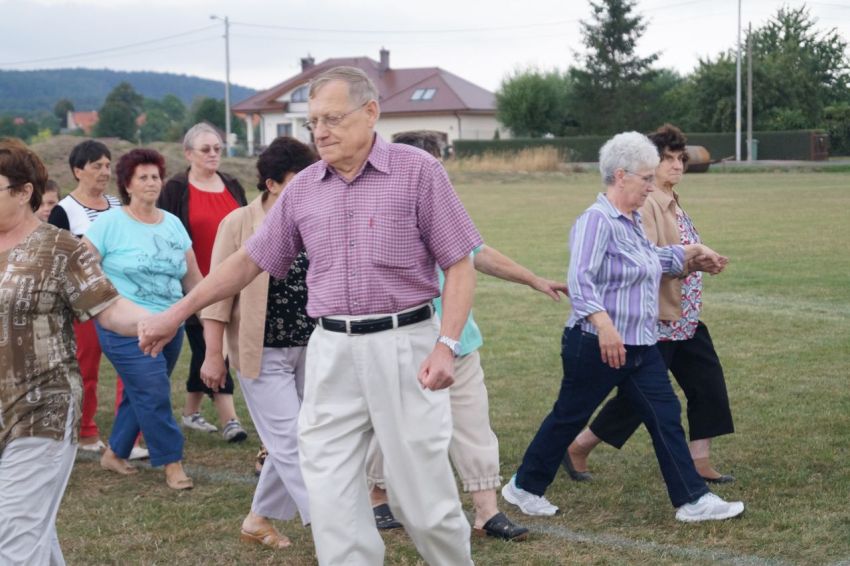 Zespoły ludowe, schola, sołtysi i rady sołeckie z gminy Męcinka czynnie uczestniczą w próbach tańca poloneza, które odbywają się na boisku w Męcince.