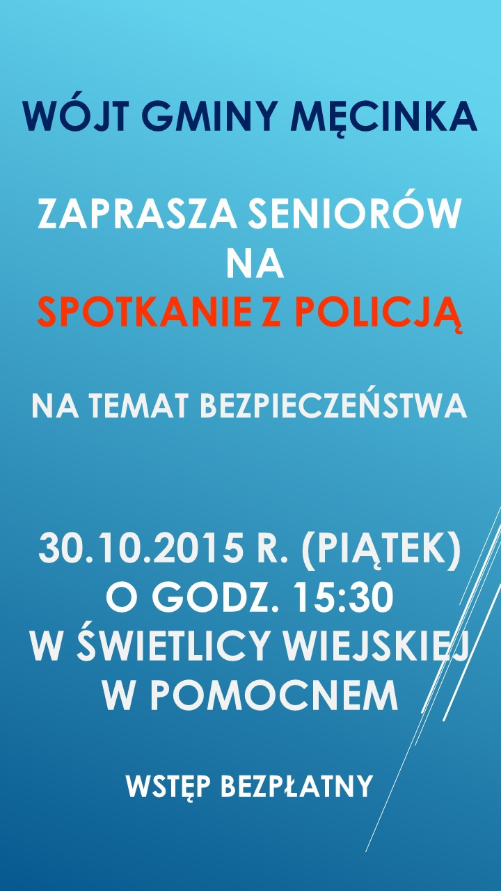 Spotkanie z policją, 30.10.2015 r. środa, 28, październik 2015 08:54 Drukuj fUdostępnij Wójt Gminy Męcinka zaprasza Seniorów na: Spotkanie z policją na temat bezpieczeństwa 30.10.2015 r. (piątek) o godz. 15:30 w świetlicy wiejskiej w Pomocnem, wstęp bezpłatnyPowiększ plakat (format JPG)