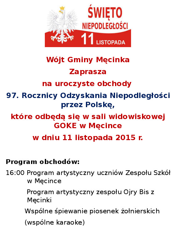 Uroczyste obchody 97. Rocznicy Odzyskania Niepodległości przez Polskę czwartek, 05, listopad 2015 12:32 Drukuj fUdostępnij Wójt Gminy Męcinka Zaprasza na uroczyste obchody 97. Rocznicy Odzyskania Niepodległości przez Polskę, które odbędą się w sali widowiskowej GOKE w Męcince w dniu 11 listopada 2015 r. Powiększ plakat (format JPG)