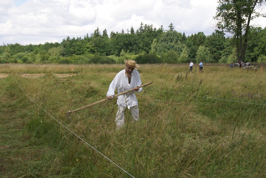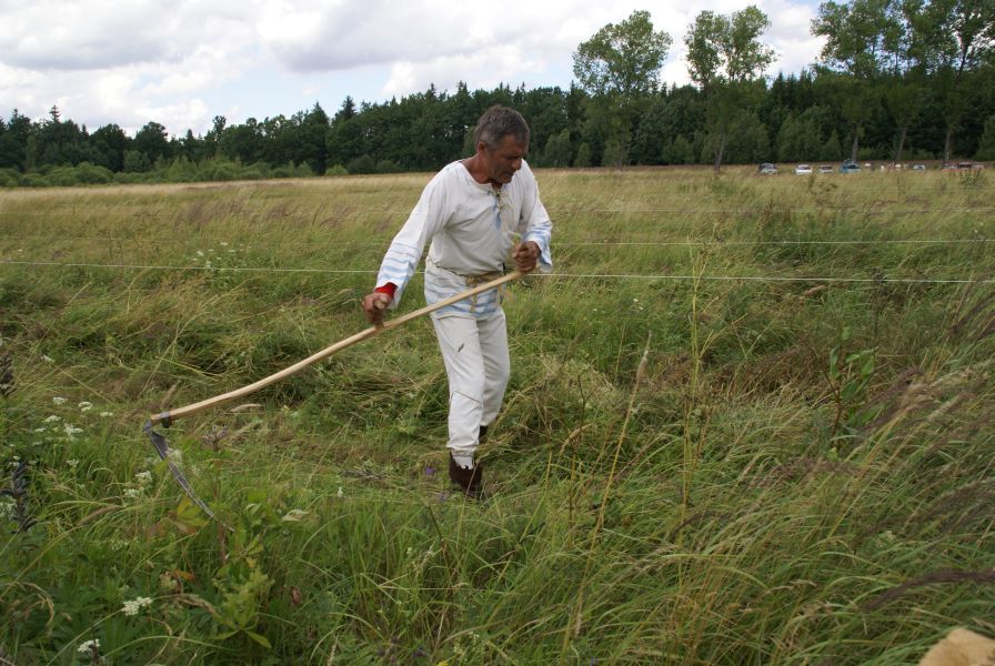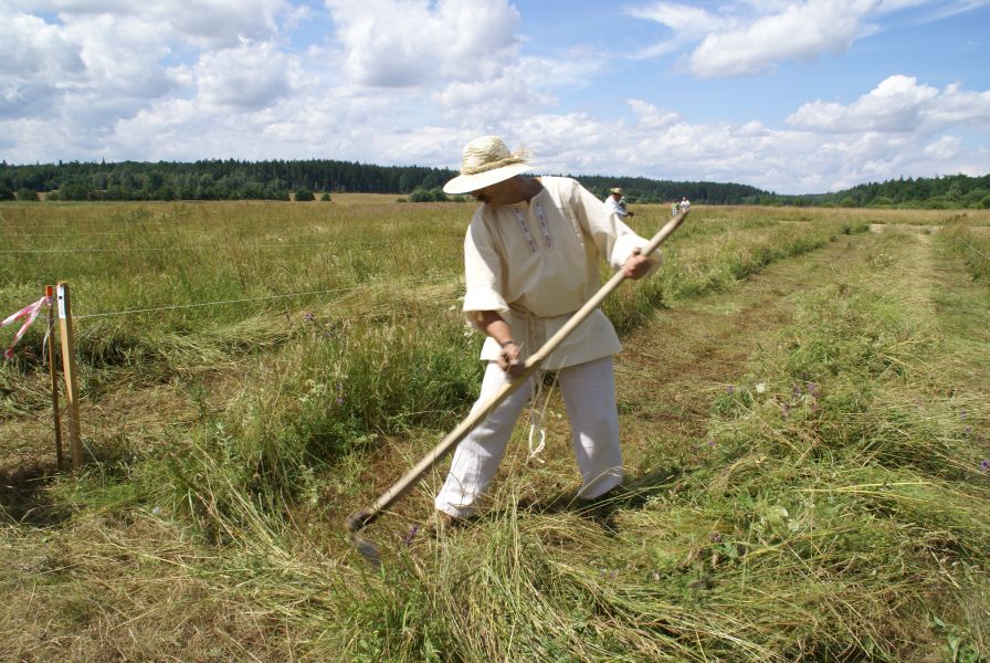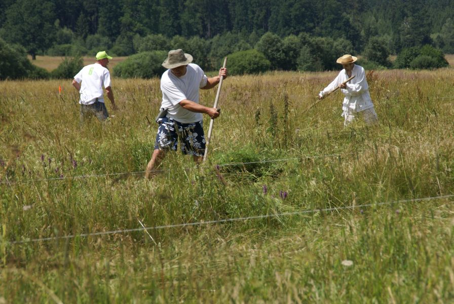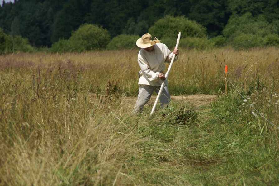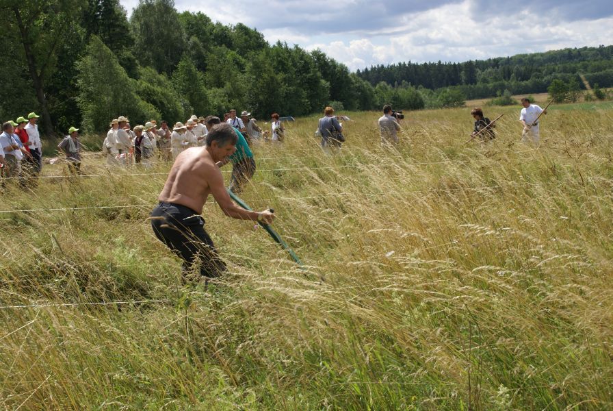 Rolnicy zamieszkujący tereny podgórskie występujące w Parku Krajobrazowym „Chełmy” często posługują się kosą jako jedynym narzędziem. W celu ochrony trzęślicowych łąk podgórskich należy je corocznie ręcznie wykaszać. Do końca lat 70. łąki te wykaszane były przez rolników, natomiast w ostatnich latach na tym obszarze zaniechano produkcji siana i na łąkach następuje zanikanie wielu gatunków roślin chronionych.
