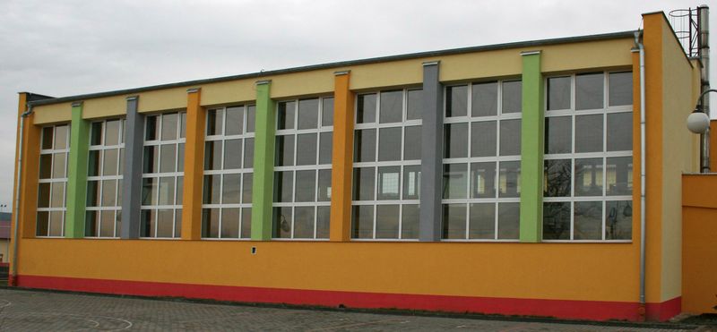dach nad salą gimnastyczną oraz ściany budynku sali i gimnazjum.
