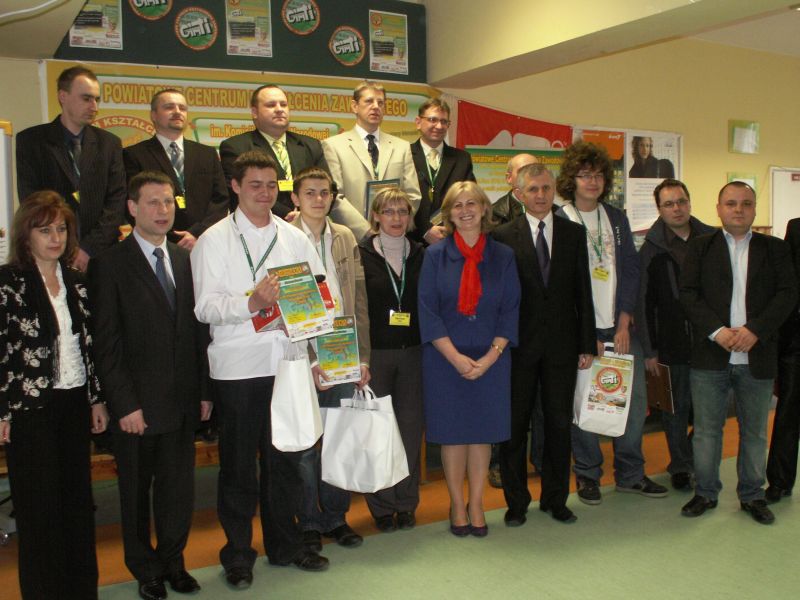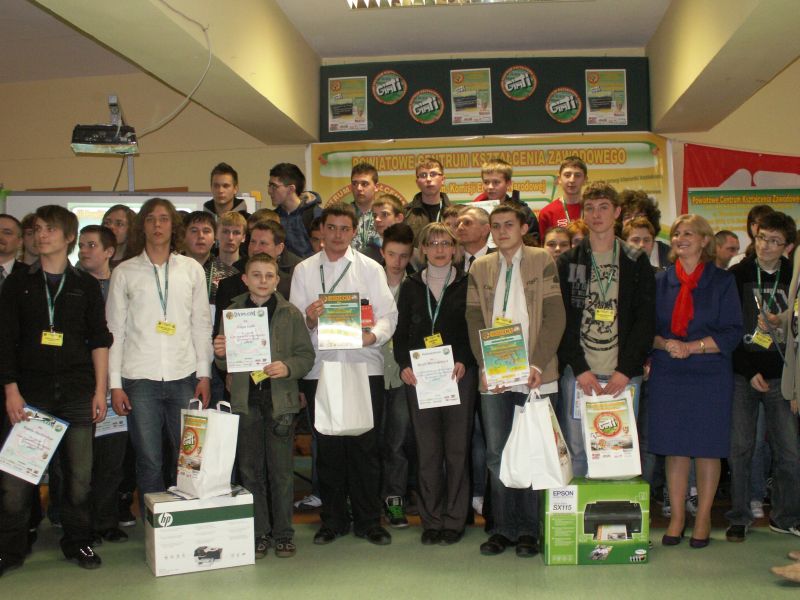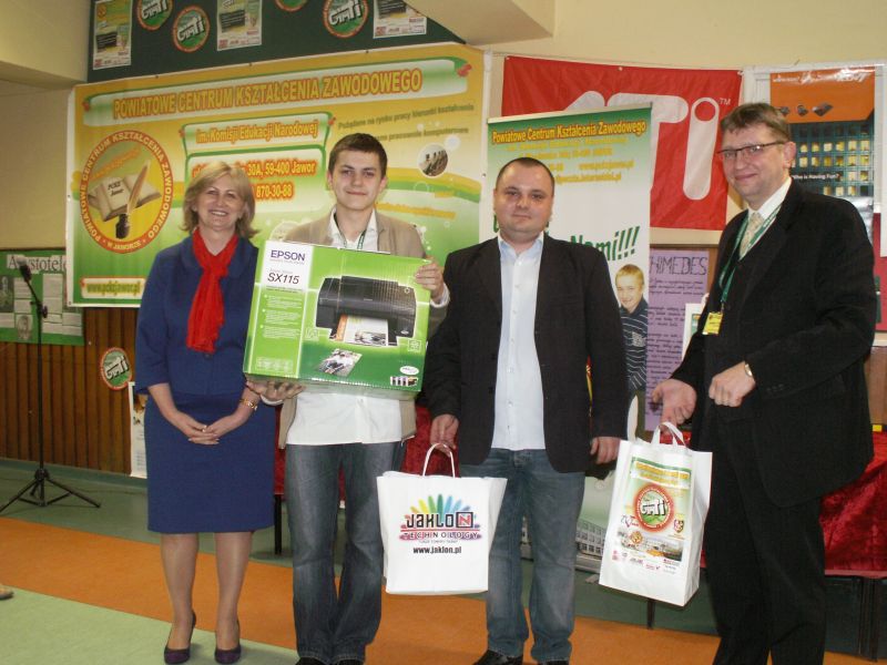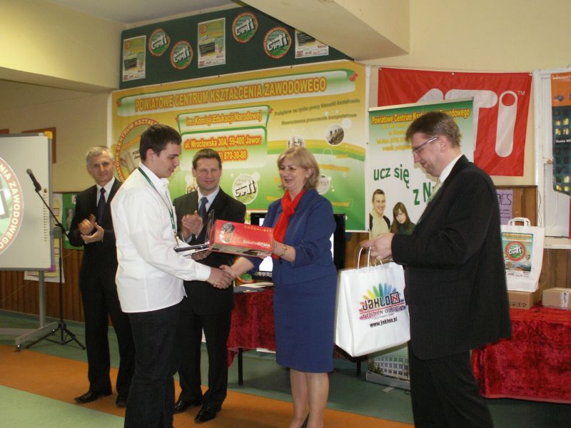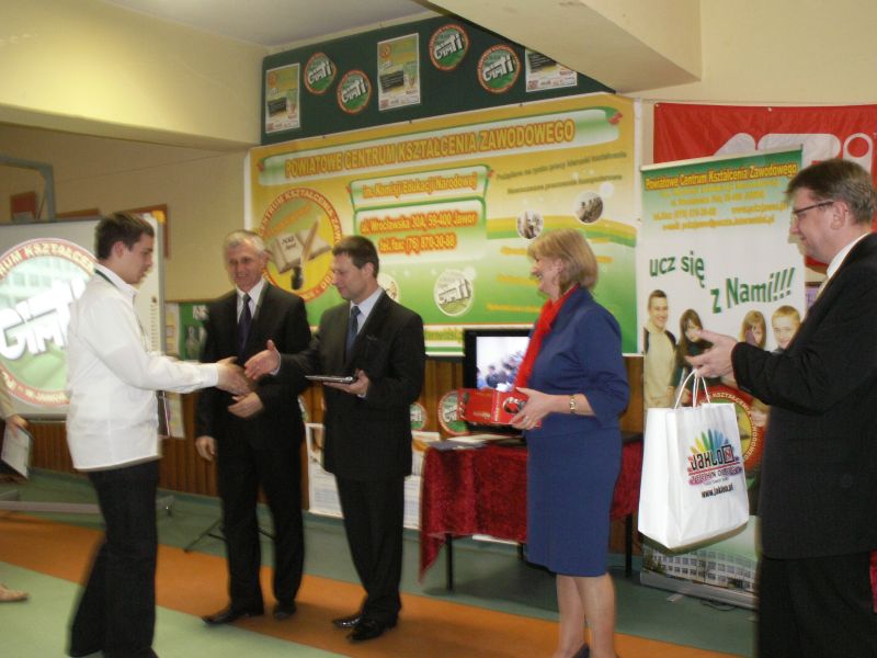 Uczniowie odebrali wspaniałe nagrody (m.in. laptop, drukarkę laserową, MP4, talony) z rąk Stanisława Laskowskiego - Starosty Jaworskiego, Michała Lenkiewicza - Wicestarosty Jaworskiego i Wandy Gołębowskiej - dyrektor PCKZ w Jaworze.