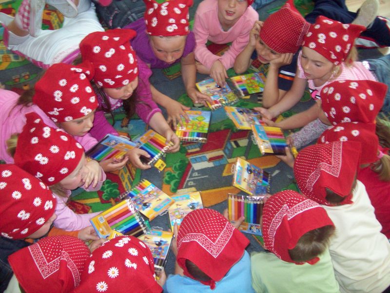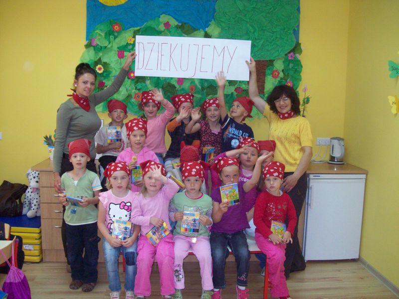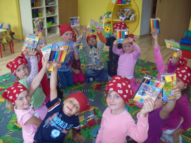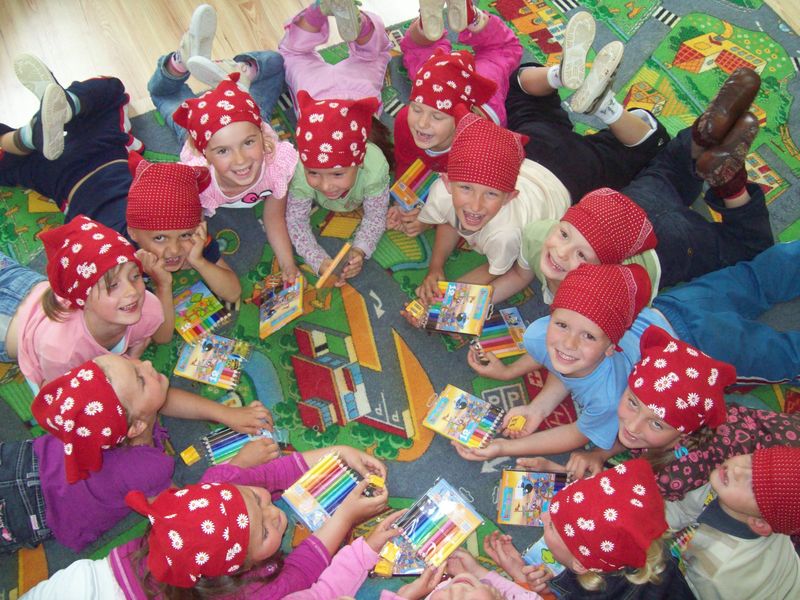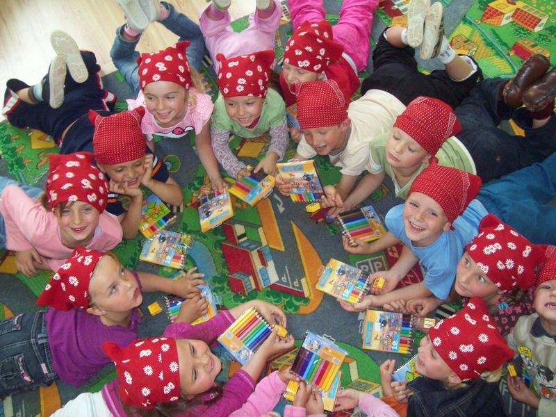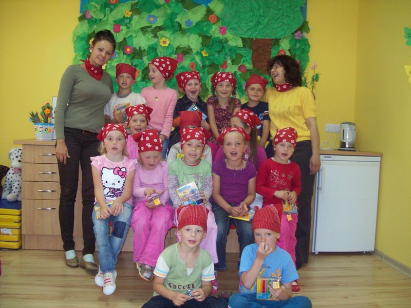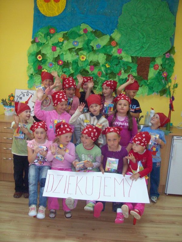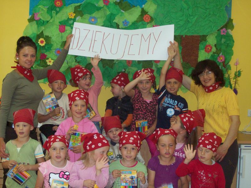 Dzieci, Rodzice i Kadra Przedszkolna Alternatywnego Ośrodka Przedszkolnego w Pomocnem dziękują wójtowi gminy Męcinka Zbigniewowi Przychodzeniowi za obecność na uroczystości w Pomocnem z okazji Międzynarodowego Dnia Dziecka i za pieniążki z Urzędu Gminy, za które zakupiono dla każdego przedszkolaka - chustki i kredki bambino. Ładnie wyglądamy?