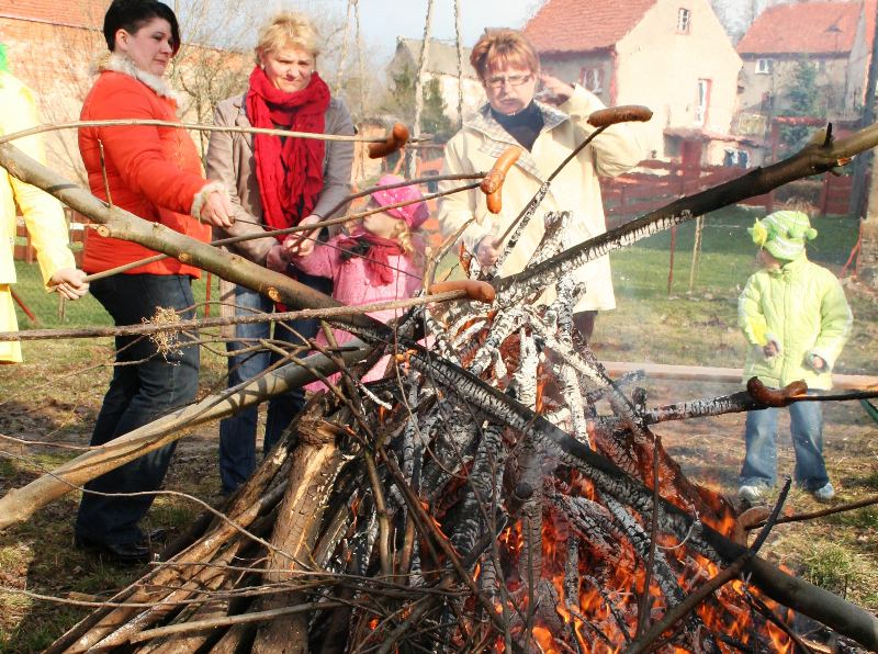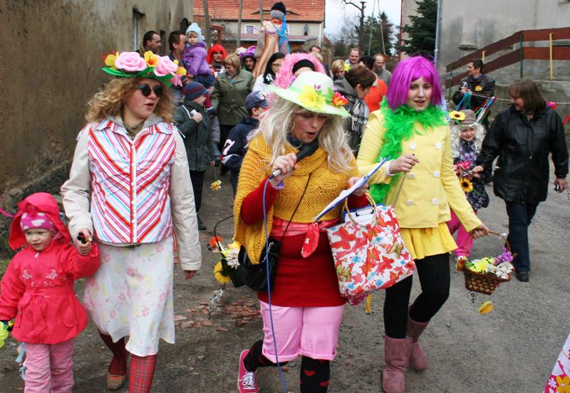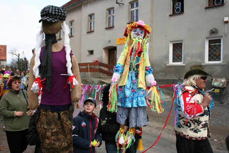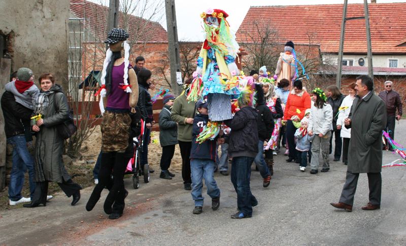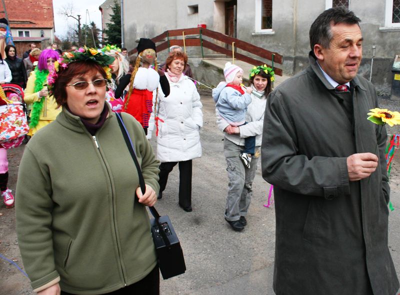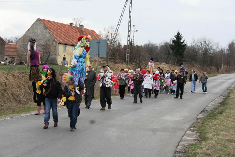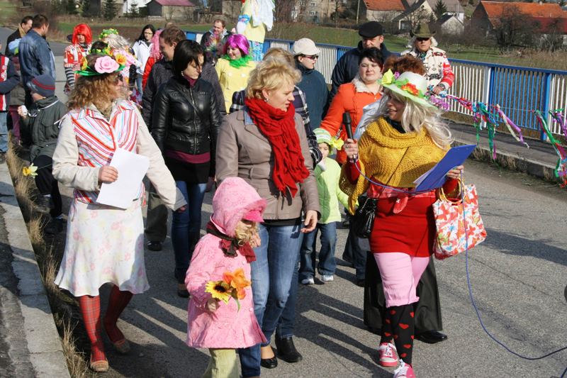 Do wiosennego korowodu zaproszony został także wójt Zbigniew Przychodzeń. Na czele z sołtys Anetą Puzio poprowadzili kolorowy pochód ulicami wsi, by nieopodal zapory pożegnać panią zimę wrzucając Marzannę do potoku. Podpalone kolorowe kukły, zgodnie z życzeniem zebranych, popłynęły do morza i od razu na niebie zajaśniało słońce. Rozśpiewany pochód powrócił do centrum wsi wzbudzając podziw kierowców. Oczywiście na tym nie koniec. Rada sołecka i miejscowi radni przygotowali pierwsze, wiosenne ognisko z pieczeniem kiełbasek. Impreza skupiła całe rodziny.