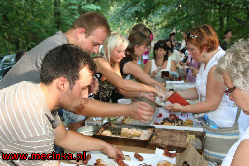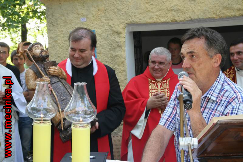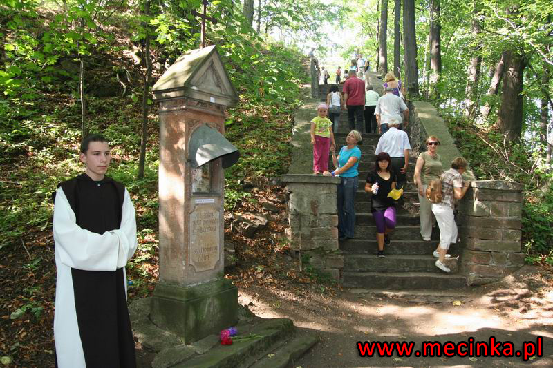 Podczas nabożeństwa na górze prowadzący ks. Bogusław Wolański nawoływał zebranych, by nie bali się krzyża. – To nie tylko relikwia, to znak, który ma pogłębiać naszą wiarę. Droga Krzyżowa to pielgrzymka przez doczesność, bo nie ma innej drogi do wieczności jak przez krzyż – mówił kapłan, często nawiązując do przykładów z życia Jana Pawła II. – Bardzo „ciężkim” krzyżem okazuje się w dzisiejszych czasach wiara i jej wyznawanie. Krzyż na naszych oczach wyrzucany jest z miejsc publicznych w myśl hasła, że wiara jest sprawą prywatną – dodał duszpasterz apelując do sumień zebranych. Msza św. zakończyła się adoracją Krzyża Zwycięstwa. Przed błogosławieństwem był też czas na podziękowania. Ksiądz Marek Kluwak dziękował pielgrzymom i wszystkim, którzy zaangażowali się w pielgrzymkę. Natomiast proboszczowi dziękował w imieniu mieszkańców wójt Zbigniew Przychodzeń, wręczając statuetkę cystersa. Były gromkie brawa, a autor rzeźby - Zdzisław Nowak z Męcinki tylko uśmiechem odpowiadał na pytania i komentarze dotyczące podobieństw statuetki do ks. Marka. Miłym akcentem była też pamięć o ks. Józefie Jóźkowie, który z rąk przewodniczącego Rady Gminy Męcinka, Wiesława Gregulskiego otrzymał pamiątkową akwarelę. Ponad ćwierć wieku temu, właśnie ks. Józef odkrzaczał te tereny i był inicjatorem renesansu Drogi Krzyżowej. Na zakończenie mszy św. uroczyście podpisane zostało porozumienie, na mocy którego połączono dwa szlaki: Cysterski i św. Jakuba. Zwieńczeniem niedzielnej pielgrzymki był rodzinny piknik. U stóp Kalwarii strażacy OSP Męcinka częstowali pątników kiełbaskami i ciastem, a spragnieni mogli ochłodzić się cysterskim kuflem złocistego napoju.