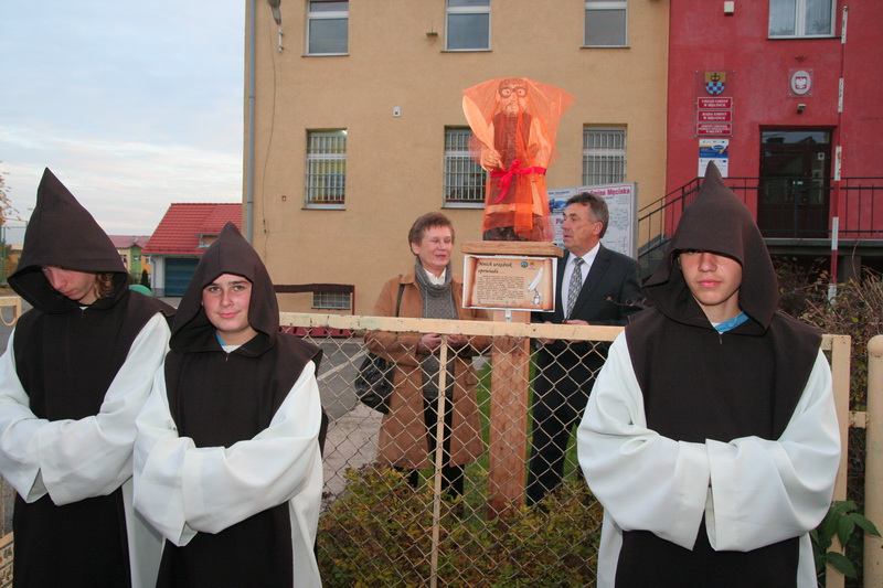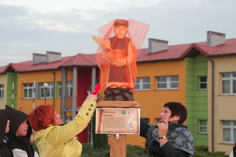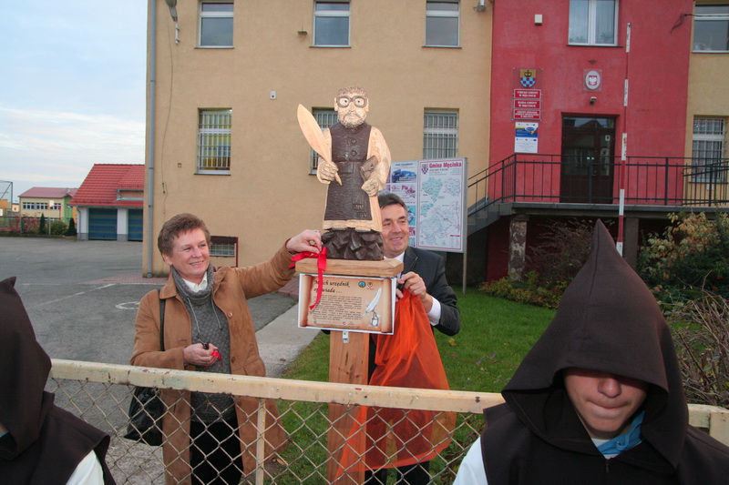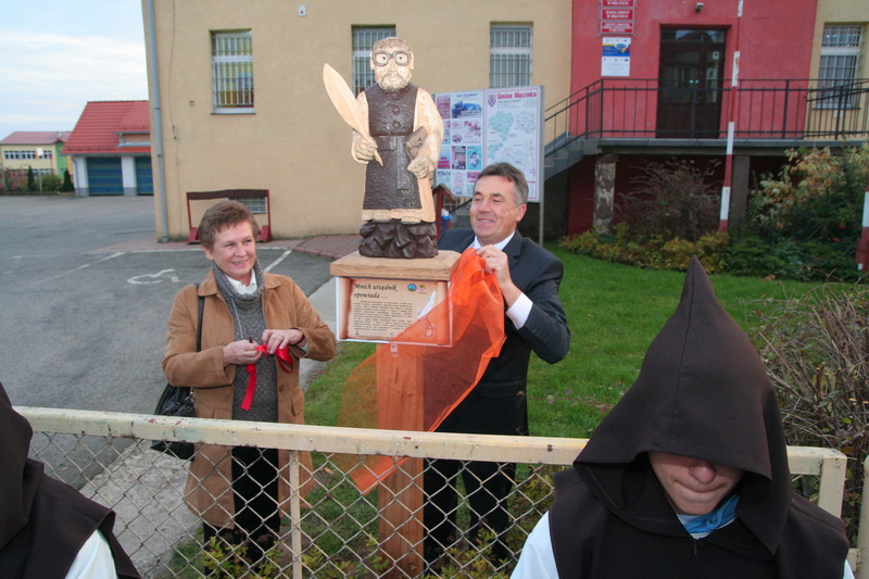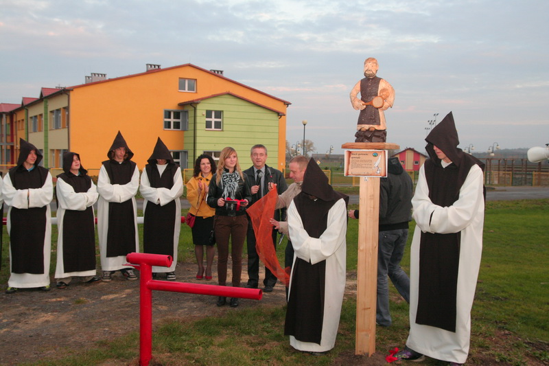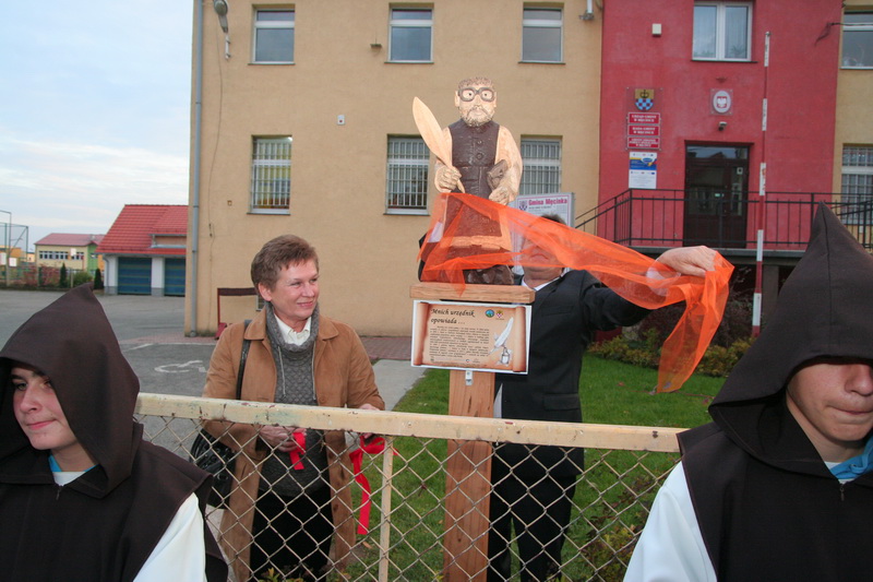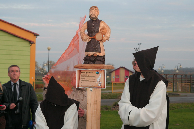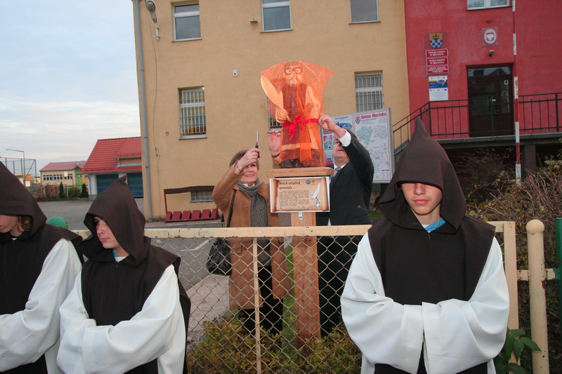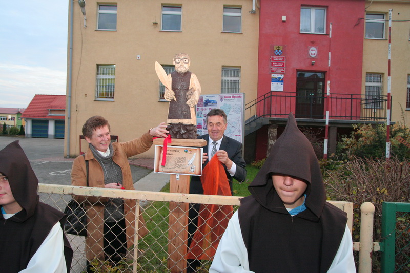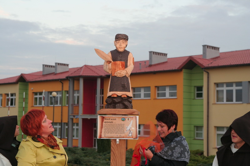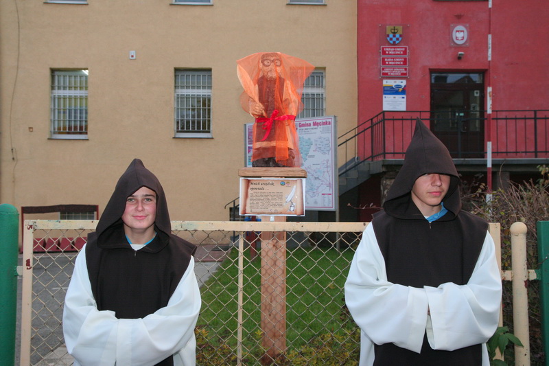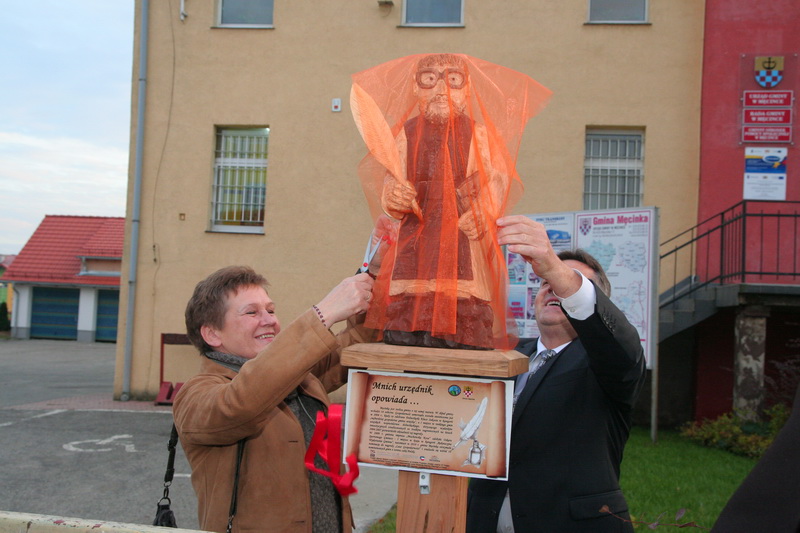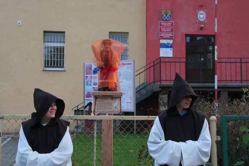 Uroczystego odsłonięcia rzeźb dokonali : mnicha strażaka - Wiesław Gregulski prezes i Huber Babiarz naczelnik wraz z druhami OSP, mnicha lekarza - Jadwiga Woźny kierownik GOZ oraz Mariola Milewicz pielęgniarka, mnicha kościelnego - Franciszek Jakubus i Andrzej Szember przedstawiciele rady parafialnej, mnicha urzędnika - Zbigniew Przychodzeń wójt i Irena Łyszczyk pracownica Urzędu Gminy Męcinka, mnicha sportowca - Robert Niemiec i Kacper Baran przedstawiciele Klubu Sportowego Męcinka, mnicha ucznia - Zofia Głowiak dyrektor Zespołu Szkół w Męcince wraz z wicedyrektor Wiolettą Kudłacz. Natomiast uroczystego odsłonięcia tablicy z mapą ukazującą lokalizację mnichów w Męcince dokonali ks. dr Marek Kluwak proboszcz Parafii p.w. św. Andrzeja Apostoła w Męcince, Zbigniew Przychodzeń wójt gminy oraz Stanisław Prędkiewicz radny. „Bardzo wielu mieszkańców Męcinki społecznie zaangażowało się w realizację tego pomysłu. Osoby te okazały ogromną życzliwość" - mówi Wiesław Gregulski. Szczególne podziękowania należą się wójtowi gminy oraz jego pracownikom za pomoc w pozyskaniu dotacji na realizację projektu, strażakom: Hubertowi Babiarzowi, Krzysztofowi Skorupskiemu, Wiesławowi Skorupskiemu, Sylwestrowi Grabowskiemu, Wiktorowi Łubie, Krzysztofowi Kowalskiemu, Marcinowi Marcowi, Dawidowi Skorupskiemu oraz Stanisławowi Prędkiewiczowi i Sławomirowi Szemberowi za pomoc w przygotowaniu terenu. Dziękuję paniom, które przygotowały poczęstunek: Irenie Łyszczyk, Wiesławie Kuśnierz, Ewie Gregulskiej, Dorocie Babiarz, Marii Lewickiej, Agnieszce Gregulskiej oraz Arlecie Oksińskiej, a także Iwonie Torończak i Klaudii Pelc za pomoc w prowadzeniu uroczystości.