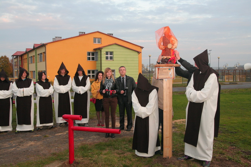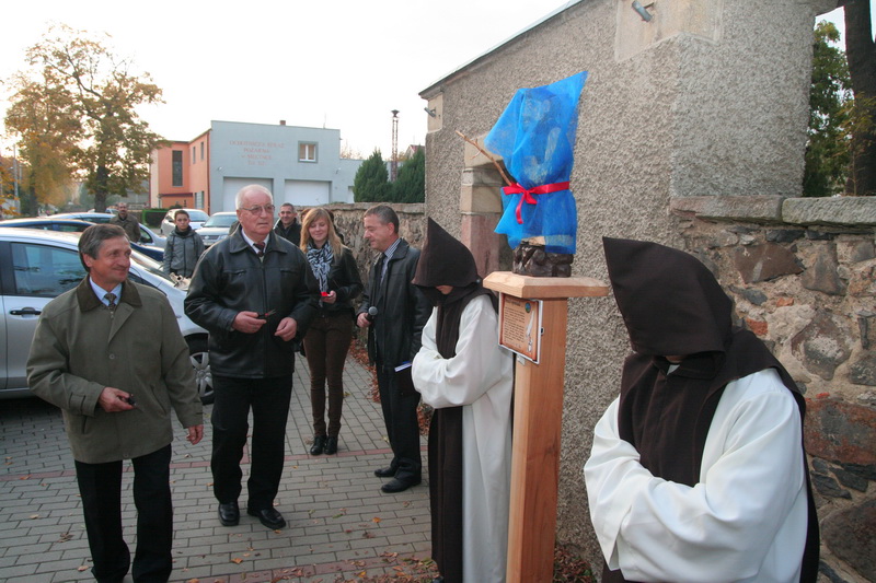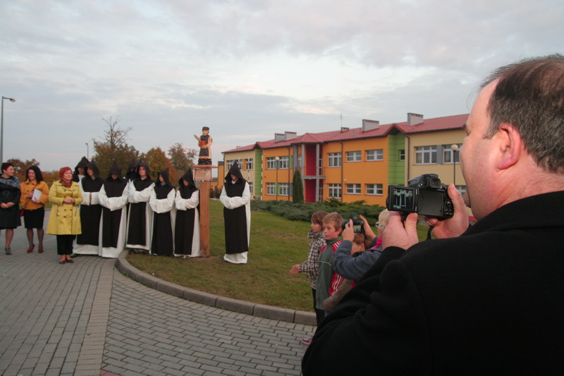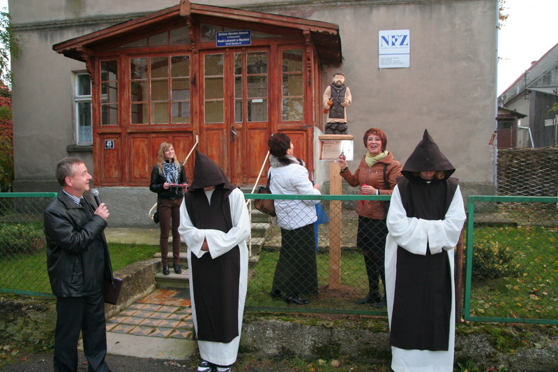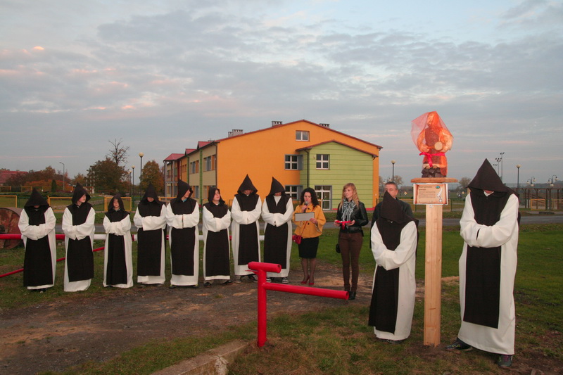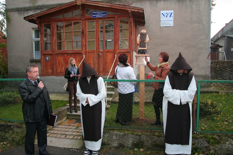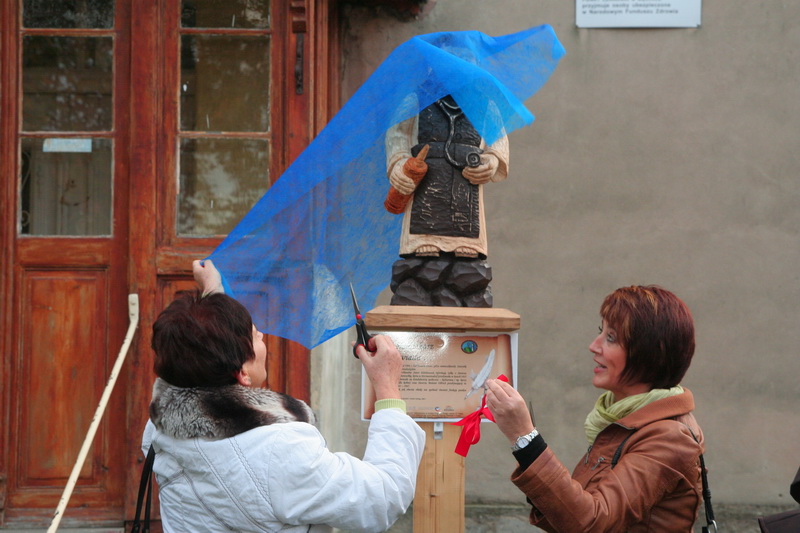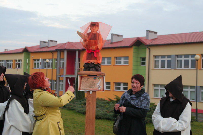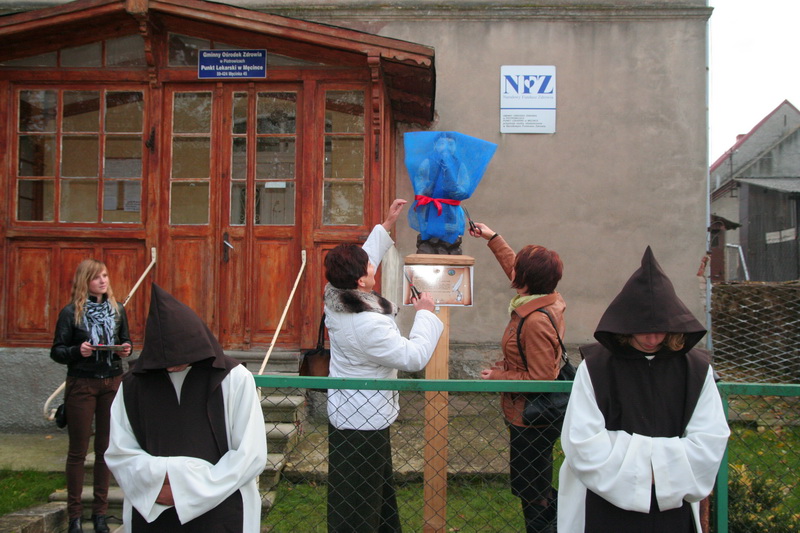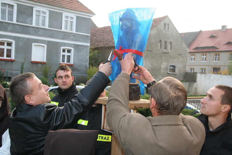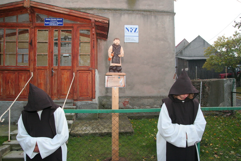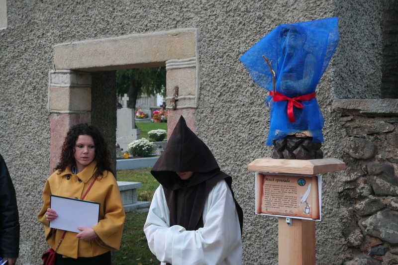 Uroczystego odsłonięcia rzeźb dokonali : mnicha strażaka - Wiesław Gregulski prezes i Huber Babiarz naczelnik wraz z druhami OSP, mnicha lekarza - Jadwiga Woźny kierownik GOZ oraz Mariola Milewicz pielęgniarka, mnicha kościelnego - Franciszek Jakubus i Andrzej Szember przedstawiciele rady parafialnej, mnicha urzędnika - Zbigniew Przychodzeń wójt i Irena Łyszczyk pracownica Urzędu Gminy Męcinka, mnicha sportowca - Robert Niemiec i Kacper Baran przedstawiciele Klubu Sportowego Męcinka, mnicha ucznia - Zofia Głowiak dyrektor Zespołu Szkół w Męcince wraz z wicedyrektor Wiolettą Kudłacz. Natomiast uroczystego odsłonięcia tablicy z mapą ukazującą lokalizację mnichów w Męcince dokonali ks. dr Marek Kluwak proboszcz Parafii p.w. św. Andrzeja Apostoła w Męcince, Zbigniew Przychodzeń wójt gminy oraz Stanisław Prędkiewicz radny. „Bardzo wielu mieszkańców Męcinki społecznie zaangażowało się w realizację tego pomysłu. Osoby te okazały ogromną życzliwość" - mówi Wiesław Gregulski. Szczególne podziękowania należą się wójtowi gminy oraz jego pracownikom za pomoc w pozyskaniu dotacji na realizację projektu, strażakom: Hubertowi Babiarzowi, Krzysztofowi Skorupskiemu, Wiesławowi Skorupskiemu, Sylwestrowi Grabowskiemu, Wiktorowi Łubie, Krzysztofowi Kowalskiemu, Marcinowi Marcowi, Dawidowi Skorupskiemu oraz Stanisławowi Prędkiewiczowi i Sławomirowi Szemberowi za pomoc w przygotowaniu terenu. Dziękuję paniom, które przygotowały poczęstunek: Irenie Łyszczyk, Wiesławie Kuśnierz, Ewie Gregulskiej, Dorocie Babiarz, Marii Lewickiej, Agnieszce Gregulskiej oraz Arlecie Oksińskiej, a także Iwonie Torończak i Klaudii Pelc za pomoc w prowadzeniu uroczystości.