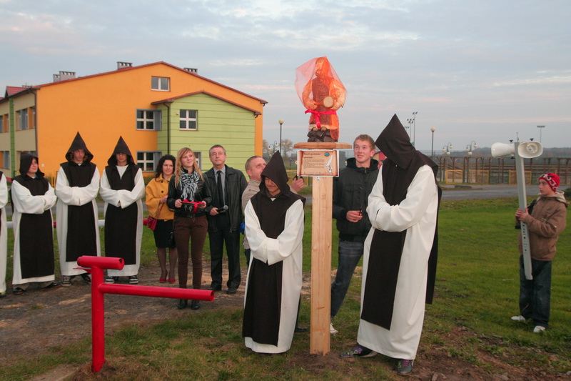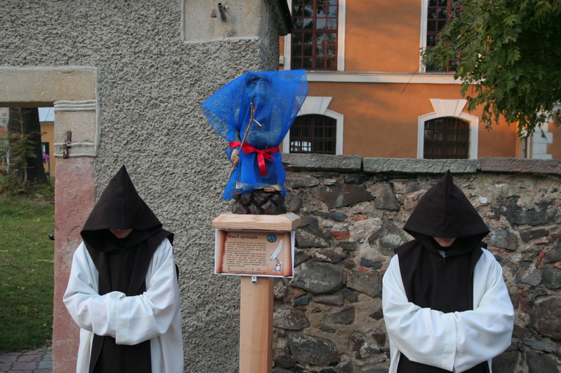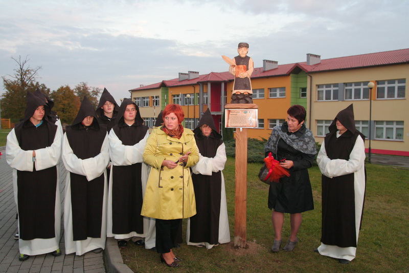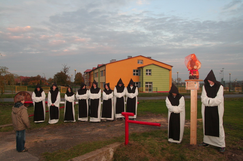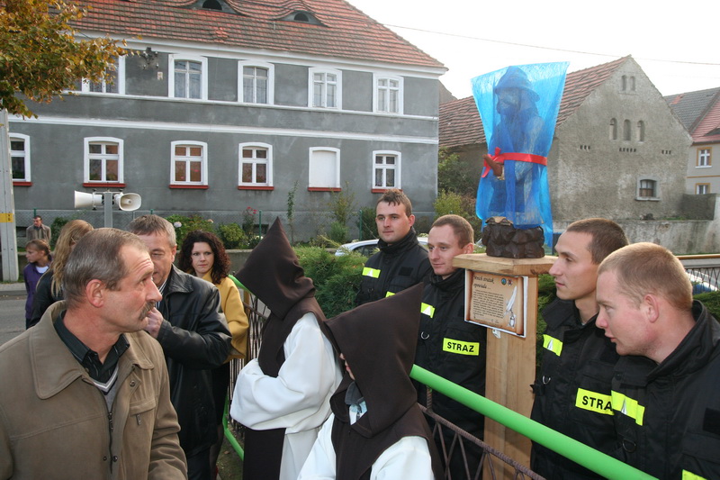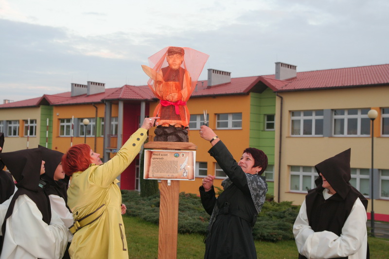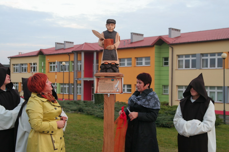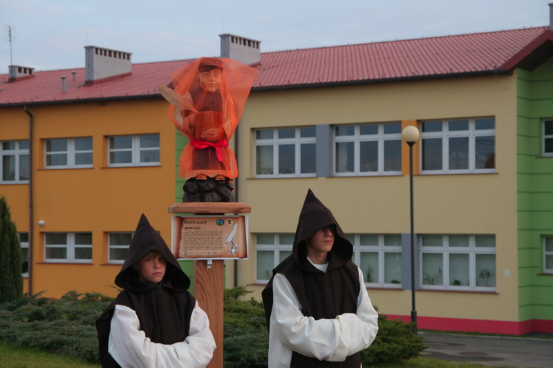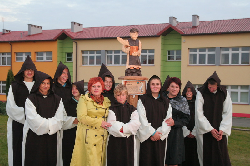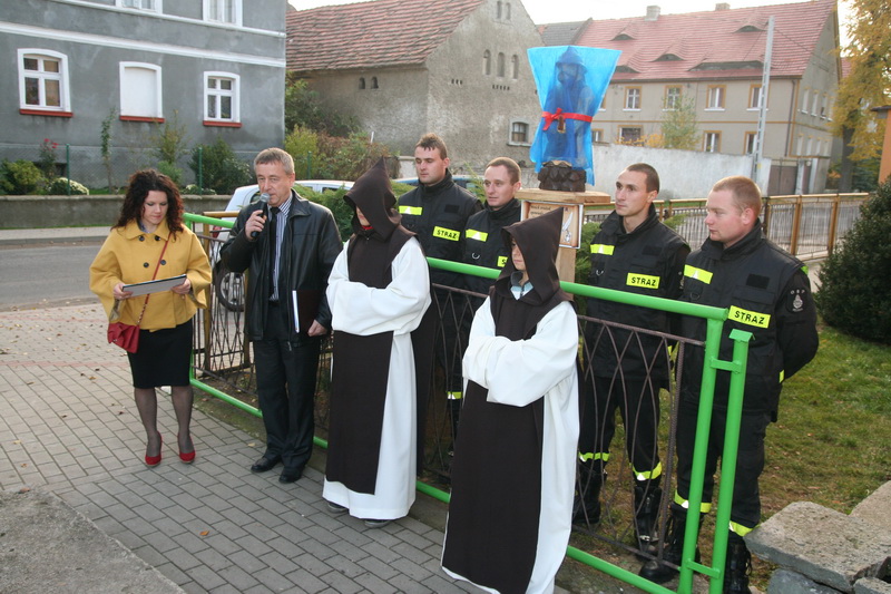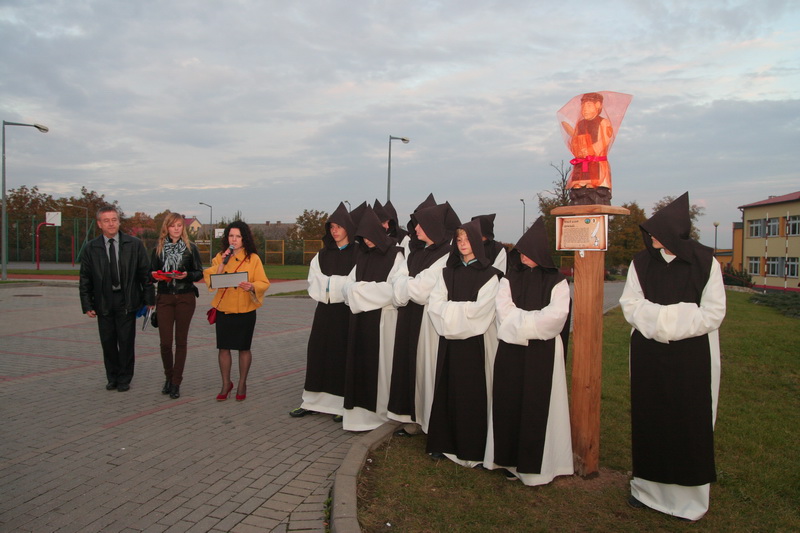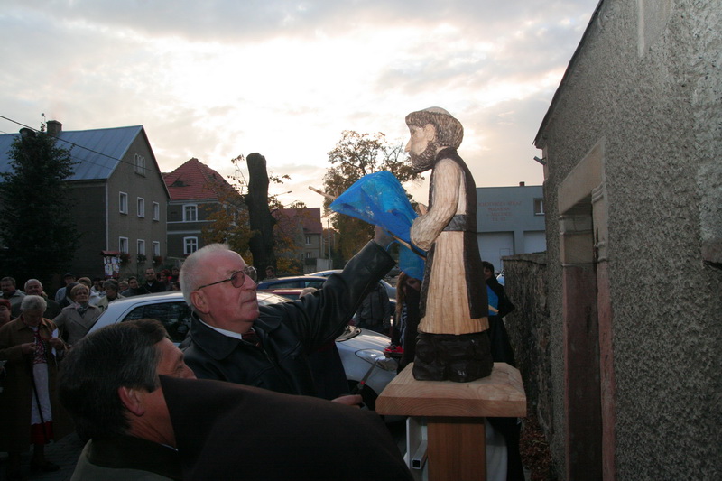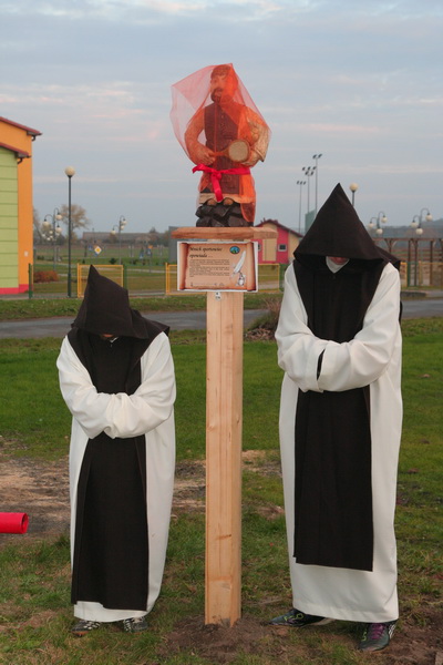 Uroczystego odsłonięcia rzeźb dokonali : mnicha strażaka - Wiesław Gregulski prezes i Huber Babiarz naczelnik wraz z druhami OSP, mnicha lekarza - Jadwiga Woźny kierownik GOZ oraz Mariola Milewicz pielęgniarka, mnicha kościelnego - Franciszek Jakubus i Andrzej Szember przedstawiciele rady parafialnej, mnicha urzędnika - Zbigniew Przychodzeń wójt i Irena Łyszczyk pracownica Urzędu Gminy Męcinka, mnicha sportowca - Robert Niemiec i Kacper Baran przedstawiciele Klubu Sportowego Męcinka, mnicha ucznia - Zofia Głowiak dyrektor Zespołu Szkół w Męcince wraz z wicedyrektor Wiolettą Kudłacz. Natomiast uroczystego odsłonięcia tablicy z mapą ukazującą lokalizację mnichów w Męcince dokonali ks. dr Marek Kluwak proboszcz Parafii p.w. św. Andrzeja Apostoła w Męcince, Zbigniew Przychodzeń wójt gminy oraz Stanisław Prędkiewicz radny. „Bardzo wielu mieszkańców Męcinki społecznie zaangażowało się w realizację tego pomysłu. Osoby te okazały ogromną życzliwość" - mówi Wiesław Gregulski. Szczególne podziękowania należą się wójtowi gminy oraz jego pracownikom za pomoc w pozyskaniu dotacji na realizację projektu, strażakom: Hubertowi Babiarzowi, Krzysztofowi Skorupskiemu, Wiesławowi Skorupskiemu, Sylwestrowi Grabowskiemu, Wiktorowi Łubie, Krzysztofowi Kowalskiemu, Marcinowi Marcowi, Dawidowi Skorupskiemu oraz Stanisławowi Prędkiewiczowi i Sławomirowi Szemberowi za pomoc w przygotowaniu terenu. Dziękuję paniom, które przygotowały poczęstunek: Irenie Łyszczyk, Wiesławie Kuśnierz, Ewie Gregulskiej, Dorocie Babiarz, Marii Lewickiej, Agnieszce Gregulskiej oraz Arlecie Oksińskiej, a także Iwonie Torończak i Klaudii Pelc za pomoc w prowadzeniu uroczystości.