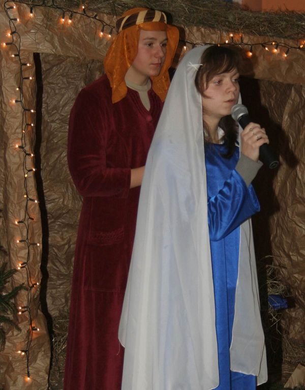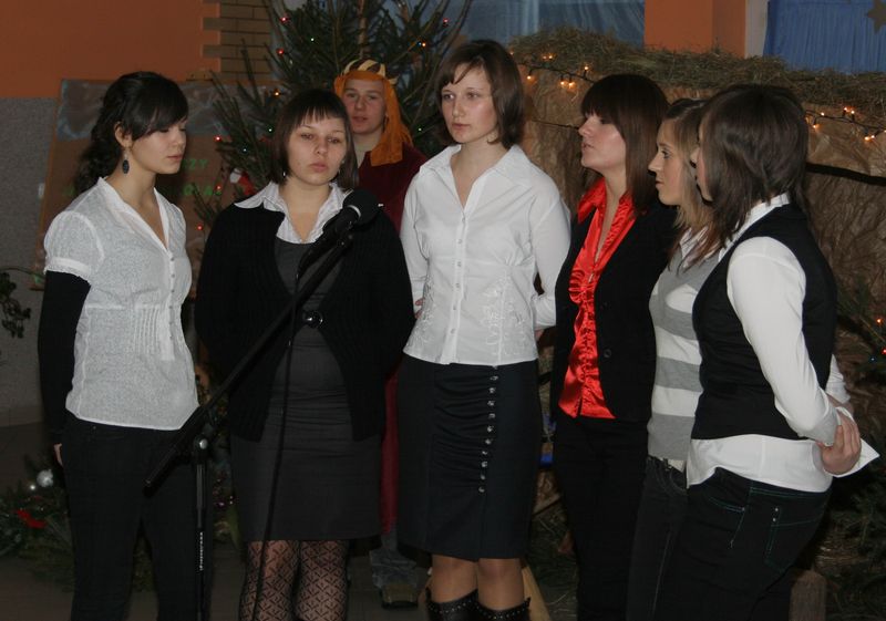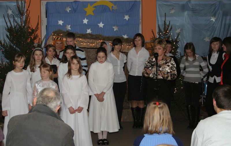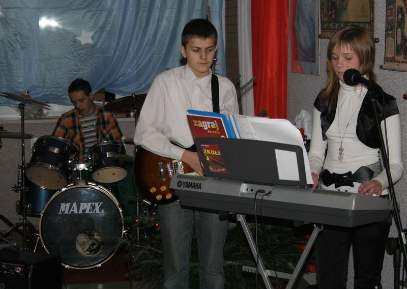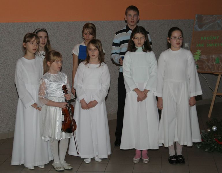W koncercie wystąpili uczniowie szkoły podstawowej i gimnazjum. Na skrzypcach zagrała „Wśród nocnej ciszy" Martynka Kostrzewa. Na perkusji Arek Torkoniak, na gitarze elektrycznej Łukasz Prędkiewicz, a na keyboardzie Paulina Buczkowska, która podobnie jak Klaudia Cilińska (Maryja) zaśpiewała solo. Józefa odegrał Patryk Słupski, zaś całość poprowadzili Patrycja Suska i Kacper Baran. W koncercie wystąpiły ponadto Magda Torończak, Paulina Łąpieś, Ada Błońska, Natalia Kostrzewa i Karolina Fitrzyk ze szkoły podstawowej oraz Agnieszka Kamińska, Agnieszka Kwaśnik, Iwona Olejniczak, Ania Staniszewska, Angelika Palonka i Ewelina Ślizak z gimnazjum. Martyna Niedzielska i Monika Bajowska zajęły się sprzedażą stroików wykonanych przez uczniów oraz płyt podarowanych przez scholę Eden. Uzyskany dochód zostanie przekazany na rzecz Caritasu.