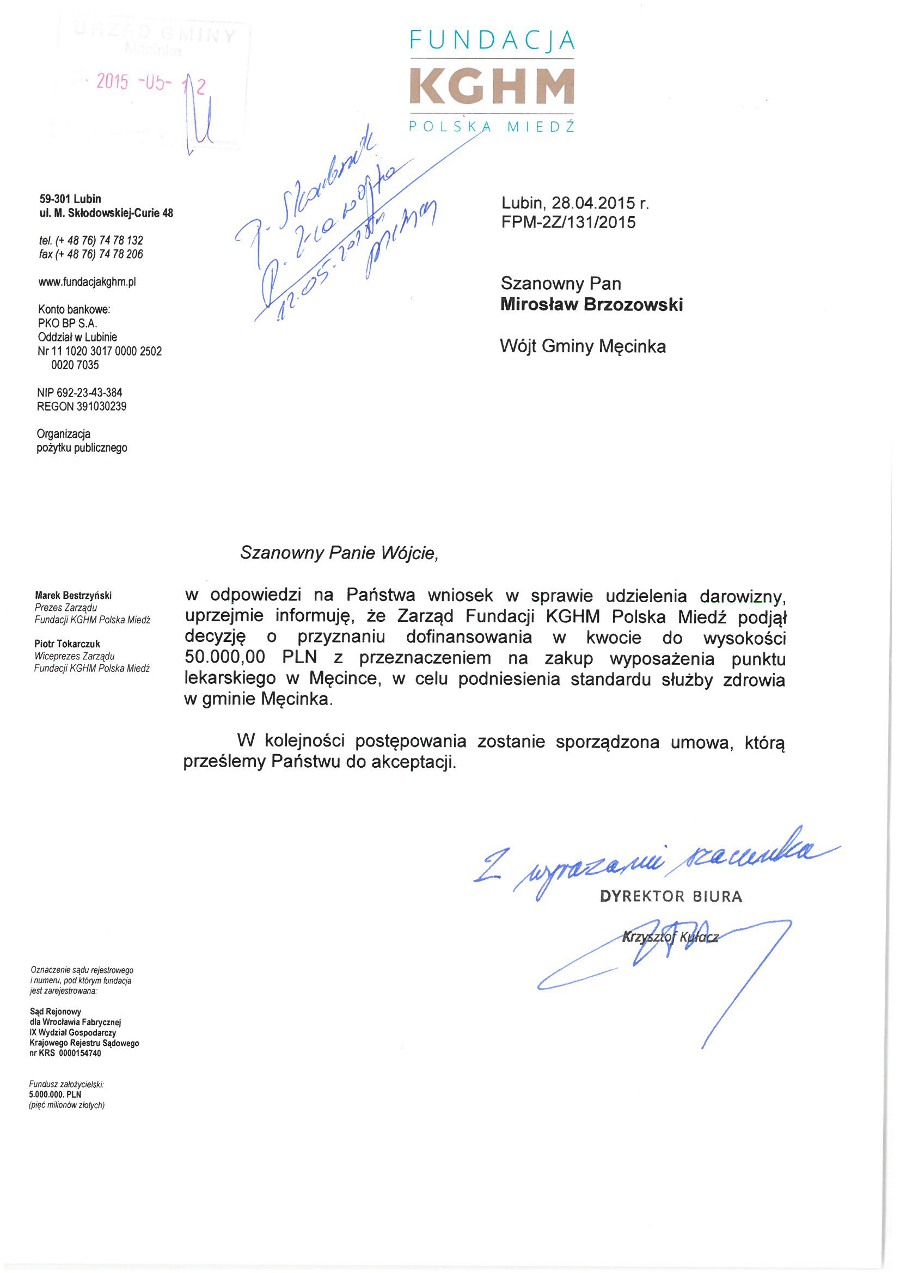 Zakup USG do punktu lekarskiego w Męcince to jedno z pierwszych działań, które podjęte zostanie w ramach realizacji obranego celu jakim jest podniesienie standardu służby zdrowia w Gminie Męcinka. Udało się pozyskać dotację w wysokości 50 000 zł z Fundacji KGHM z Lubina na doposażenie punktu lekarskiego w Męcince - USG, którego obecnie Gminny Ośrodek Zdrowia w Piotrowicach nie posiada. Pozwoli to na lepszą diagnostykę pacjentów przez lekarzy pierwszego kontaktu oraz ściągnięcie specjalistów do naszej gminy.