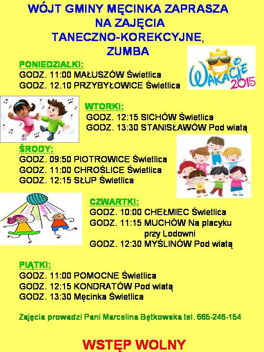 Zajęcia Wakacyjne w Gminie Męcinka piątek, 24, lipiec 2015 10:49 Drukuj fUdostępnij ZACZYNAMY OD 27 LIPCA (PONIEDZIAŁEK) Szczegóły, miejsce i godziny zajęć - powiększ plakat (format JPG)