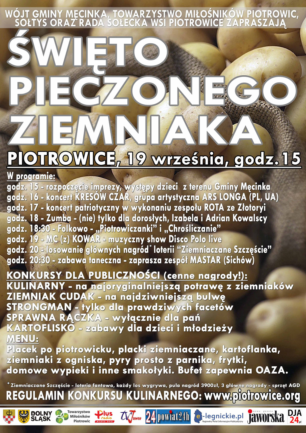 Uczestnikami konkursu kulinarnego mogą być mieszkańcy gminy Męcinka. Zadaniem jest przyrządzenie potrawy, której głównym składnikiem będą ziemniaki. Do konkursu można zgłosić jedną potrawę. Ocenie podlegać będą oryginalność przepisu, walory smakowe i zapachowe oraz estetyka i sposób podania. Potrawy zgłoszone do konkursu należy dostarczyć wraz z przepisem na miejsce imprezy, tj. do parku w Piotrowicach, 19 września br. do godz.16.30.