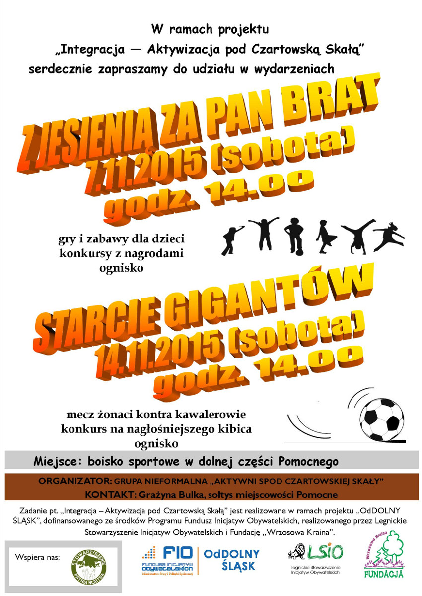 W ramach projektu "Integracja - Aktywizacja pod Czartowską Skałą" serdecznie zapraszamy do udziału w wydarzeniach:STARCIE GIGANTÓW, 14.11.2015 (sobota) godz. 14.00