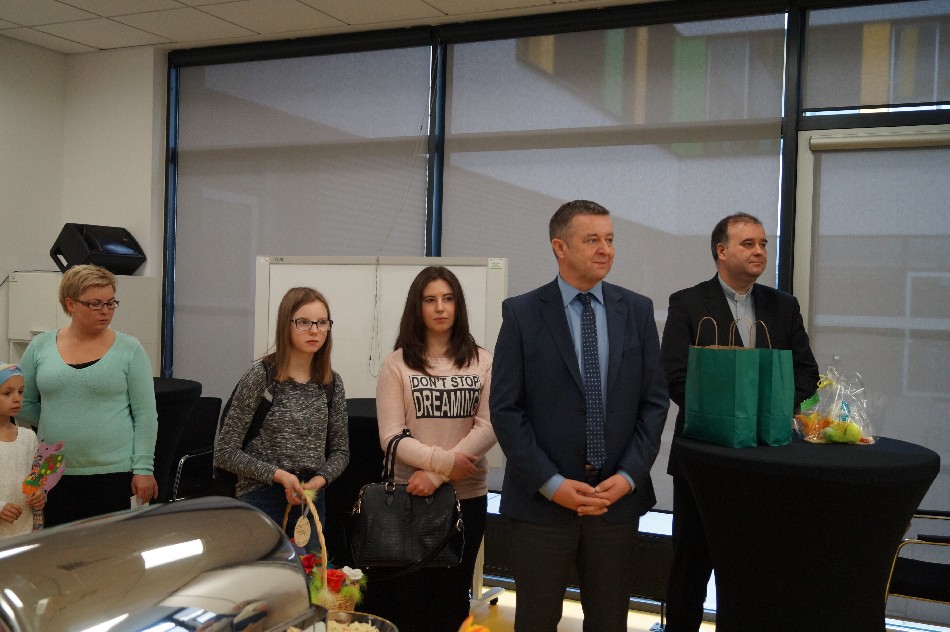 Delegacja, w skład której wchodzili wójt Mirosław Brzozowski, ks. dr Marek Kluwak, zastępca wójta Arleta Gregulska – Oksińska oraz gimnazjalistki Klaudia Malina i Karolina Uhornicka wzięła udział w spotkaniu wielkanocnym podopiecznych i pracowników kliniki. Oprócz kartek z życzeniami nasi przedstawiciele przekazali dzieciom słodycze.