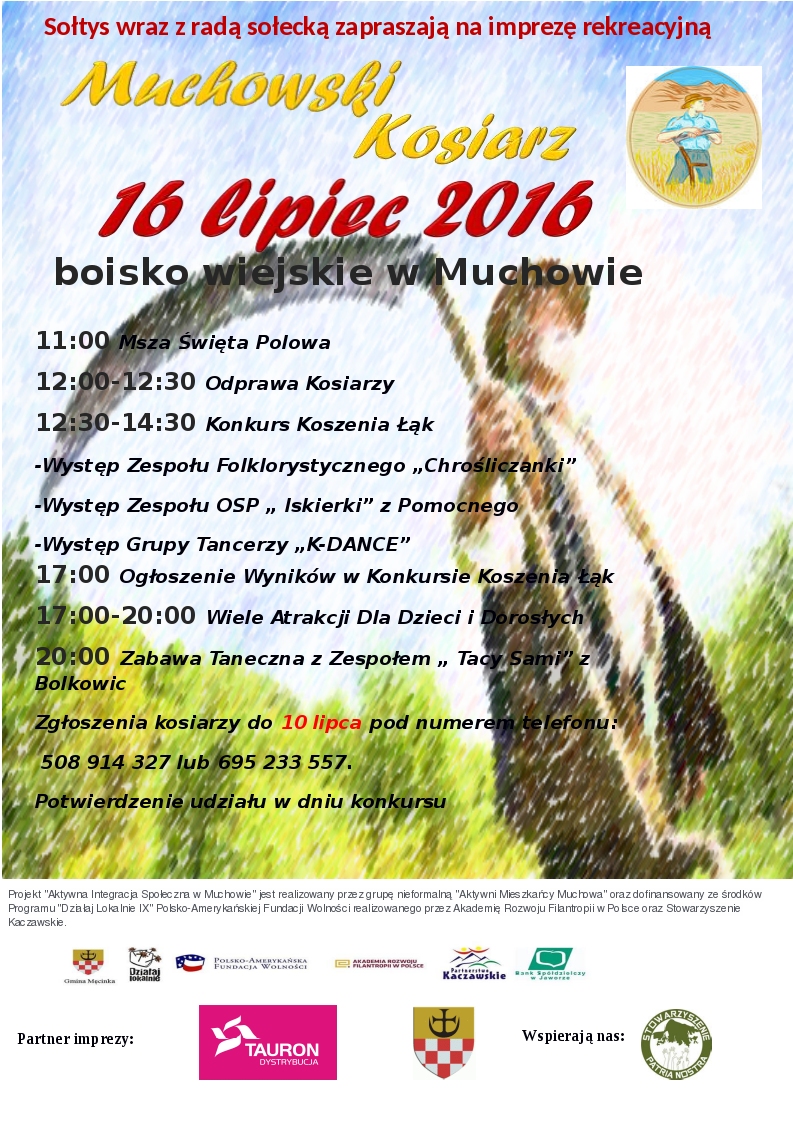 Muchowski Kosiarz, 16 lipca 2016 r. piątek, 08, lipiec 2016 10:41 Drukuj fUdostępnij Sołtys wraz z radą sołecką zapraszają na imprezę rekreacyjną Muchowski Kosiarz 16 lipca 2016 r. boisko wiejskie w Muchowi Więcej informacji - powiększ plakat (format JPG)