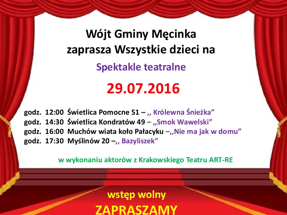 Wójt Gminy Męcinka zaprasza Wszystkie dzieci na Spektakle teatralne: