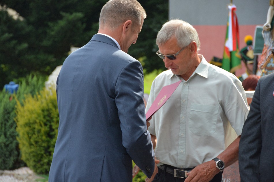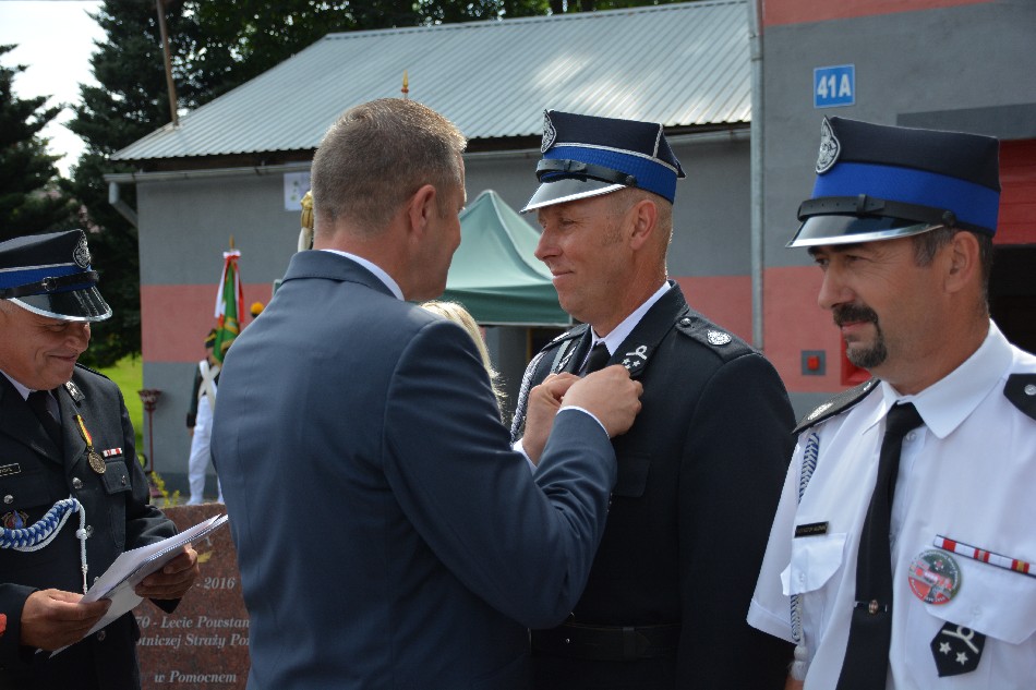 „Dzisiejsza uroczystość ma wymiar szczególny, świętujemy bowiem 70-lecie powołania do życia OSP w Pomocnem. Świętujemy rocznicę działalności stowarzyszenia, które stawiało sobie od początku istnienia za cel niesienie bezinteresownej pomocy człowiekowi, będącemu w potrzebie. Dziękuję za wiele lat bezinteresownej służby bliźniemu na wszystkich kierunkach Waszej bogatej działalności. Charakter Waszej pracy sprawia, że podejmowane decyzje mają bezpośredni wpływ na zdrowie i życie tych, którym często jako pierwsi śpieszycie na ratunek. Wasza postawa sprawia, że jesteście kojarzeni z poczuciem bezpieczeństwa, wzbudzacie powszechny szacunek i zaufanie. Życzę Wam bezpiecznej służby, zawsze szczęśliwych powrotów z akcji oraz by służba, której się podjęliście była dla Was źródłem satysfakcji i poczucia dobrze spełnionego obowiązku. Gratuluję zorganizowania tak pięknej uroczystości.” – powiedział wójt Mirosław Brzozowski