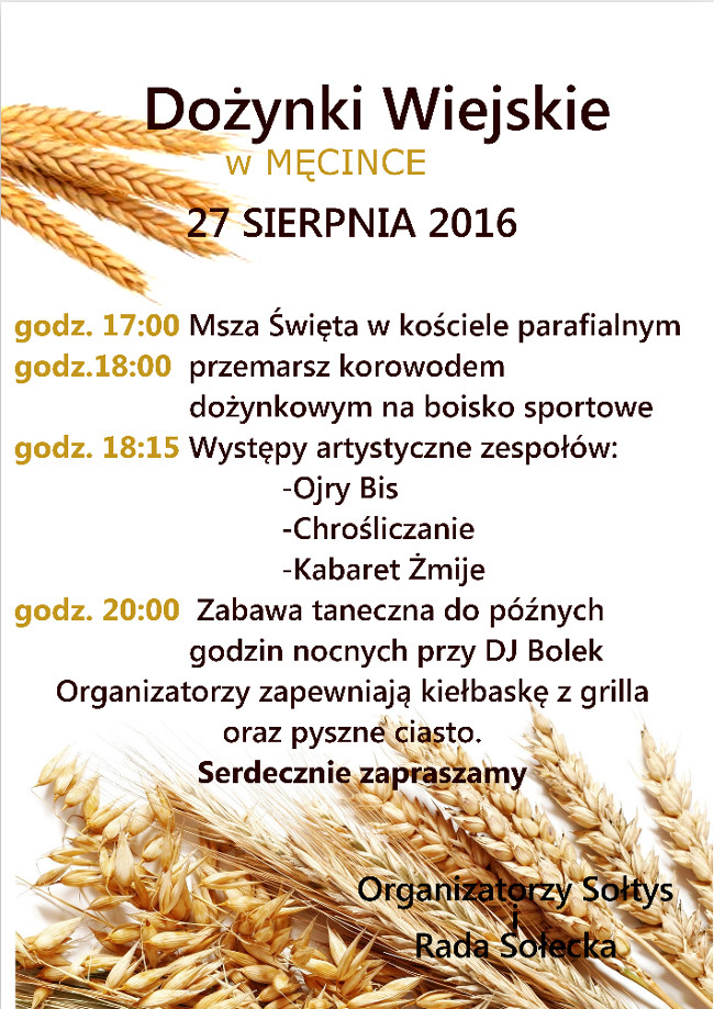 Dożynki Wiejskie w Męcince środa, 24, sierpień 2016 08:44 Drukuj fUdostępnij Dożynki Wiejskie w Męcince 27 sierpnia 2016 Serdecznie zapraszamy Powiększ plakat (format JPG)