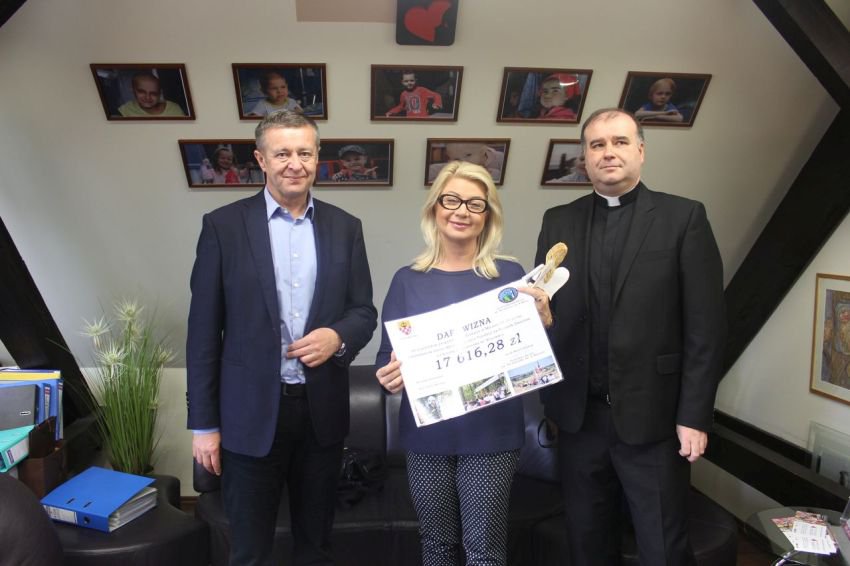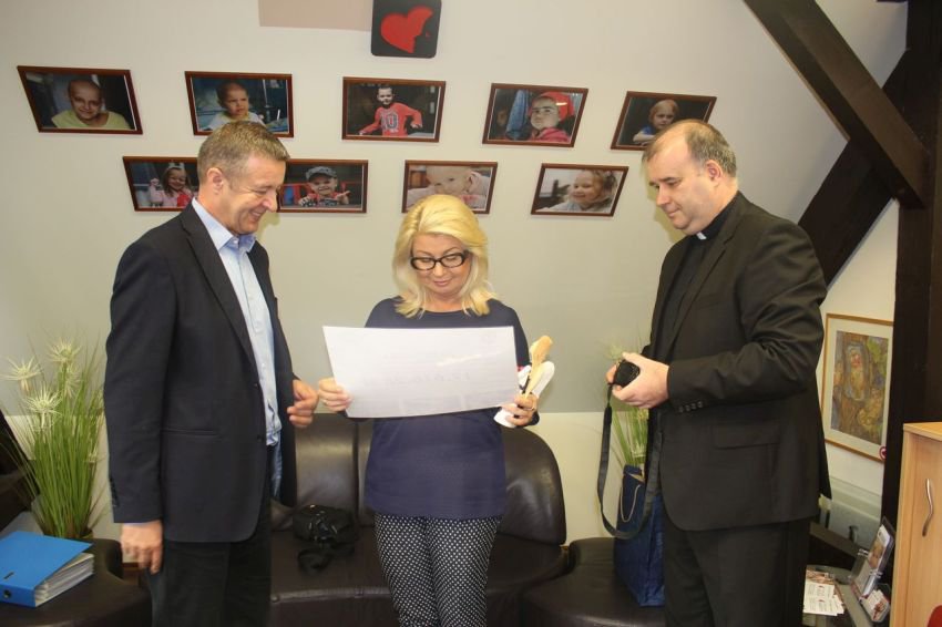 Kwota 17 616,28 zł, którą uzbierali uczestnicy tegorocznej pielgrzymki na Kalwarię w Męcince przekazana została przez ks. dr. Marka Kluwaka Proboszcza Parafii w Męcince oraz Wójta Gminy Męcinka Mirosława Brzozowskiego na ręce prezes Fundacji na Ratunek Dzieciom z Chorobą Nowotworową Wrocławskiej Kliniki Transplantacji Szpiku, Onkologii i Hematologii Dziecięcej we Wrocławiu pani Agnieszki Aleksandrowicz.