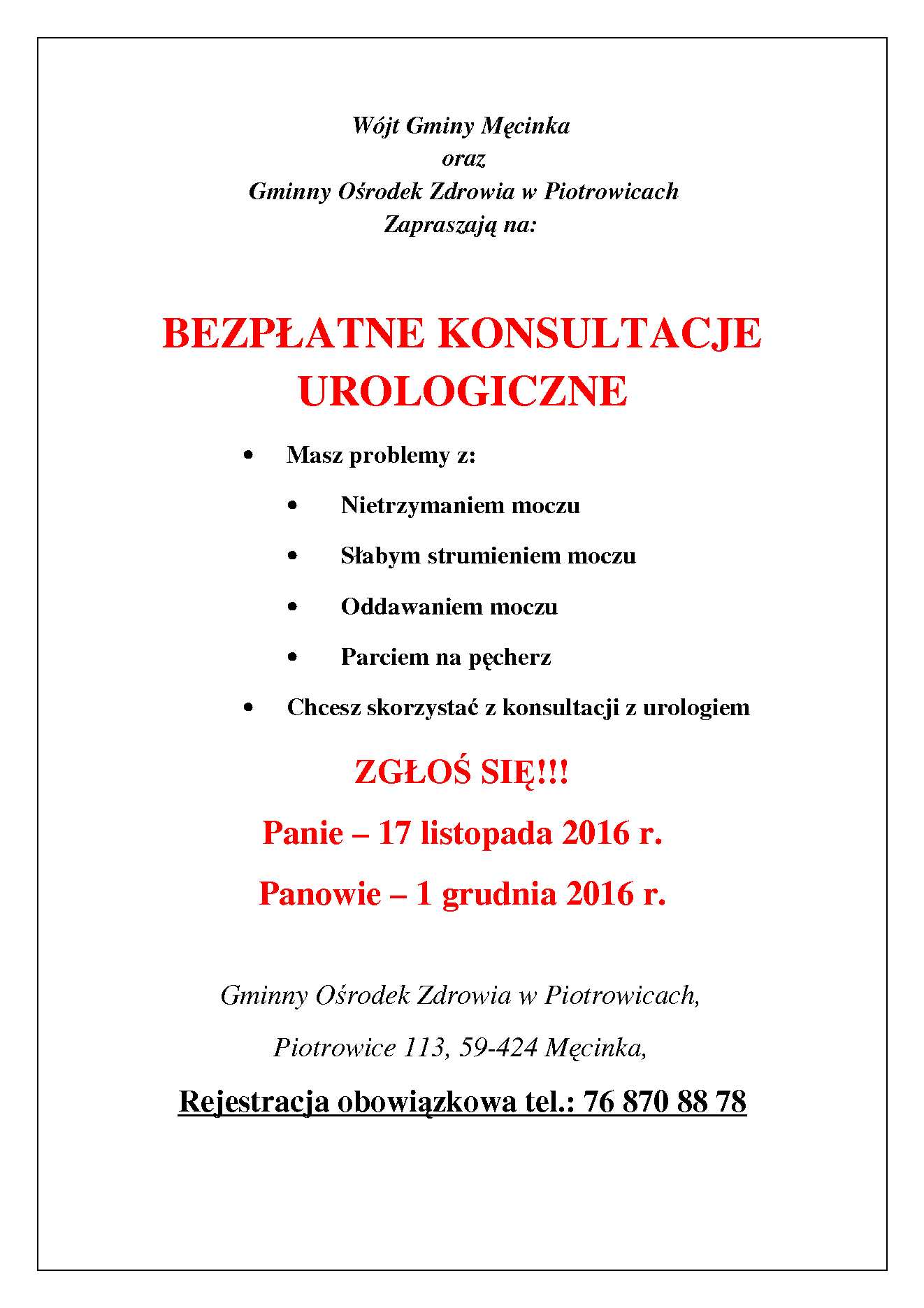 BEZPŁATNE KONSULTACJE UROLOGICZNE środa, 09, listopad 2016 08:17 Drukuj fUdostępnij Wójt Gminy Męcinka oraz Gminny Ośrodek Zdrowia w Piotrowicach Zapraszają na: BEZPŁATNE KONSULTACJE UROLOGICZNE